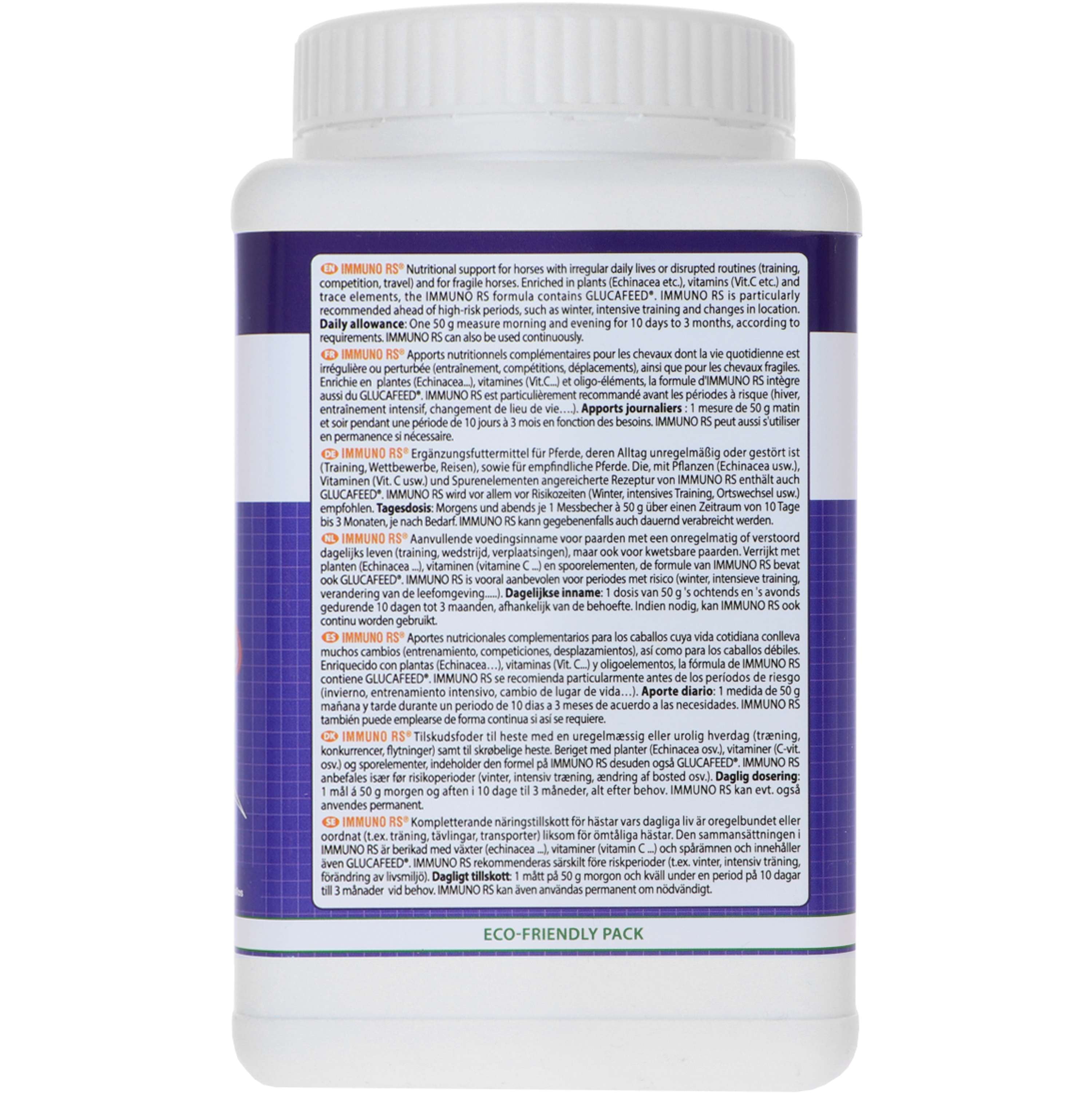 Un integratore studiato per soddisfare le esigenze nutrizionali del cavallo durante la stagione ad alto rischio e durante cambiamenti significativi (freddo, cambio di compagni di stalla, svezzamento, ecc.), nonché per i cavalli più deboli. Contiene Echinacea e Glucafeed®, un ingrediente studiato nei cavalli che rafforza il sistema immunitario. Aiuta i tuoi clienti a pianificare in anticipo i periodi ad alto rischio con giovani puledri, cavalli in allenamento intensivo e cambiamenti nell'ambiente in cui vive il cavallo. IMMUNO RS è inoltre raccomandato per aiutare a prevenire potenziali perdite di condizione. Fornitura per 50 giorni.