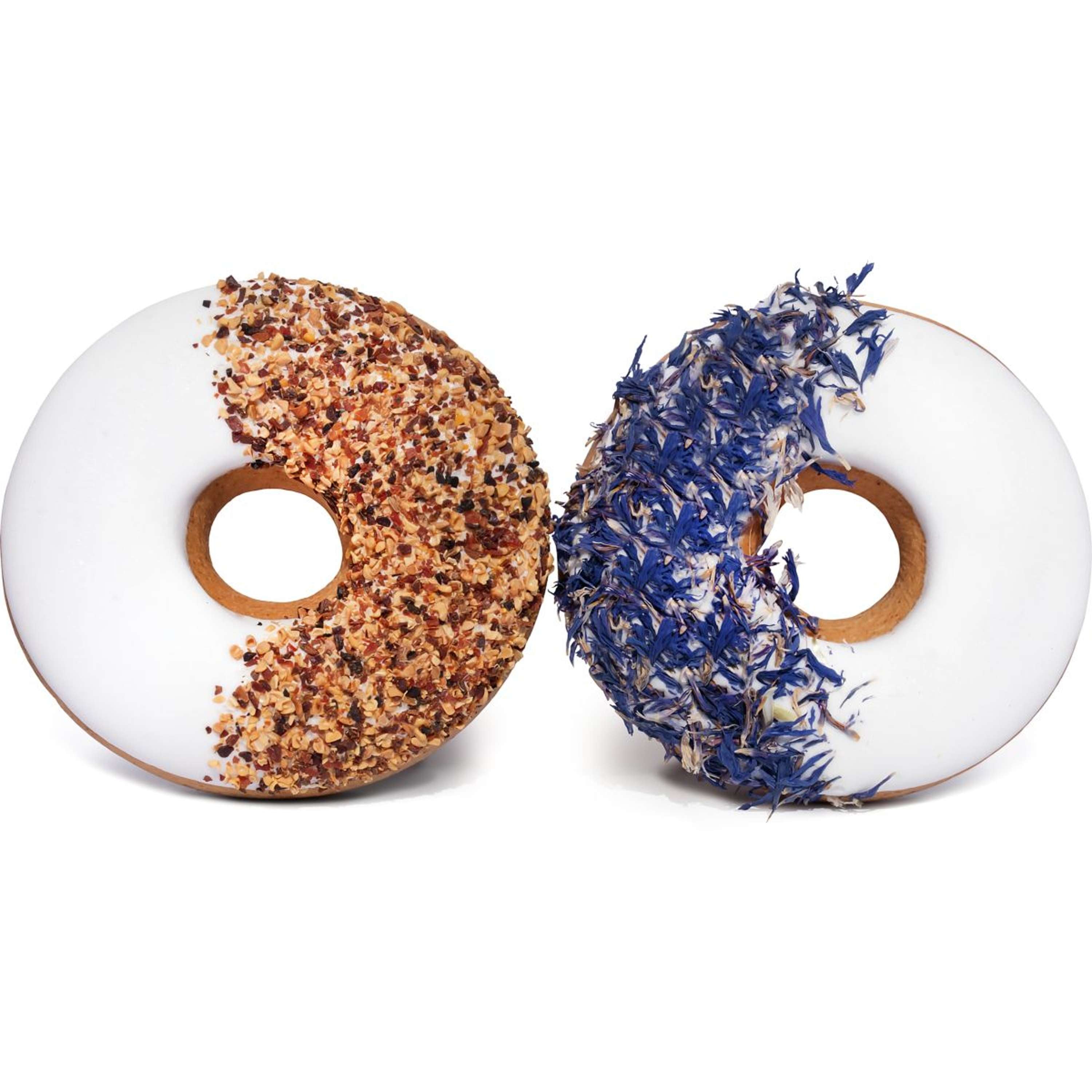 Due ciambelle a forma di cavallo fatte a mano con fiordaliso e rosa canina: colorate, naturali e ricche di benefici per la salute.