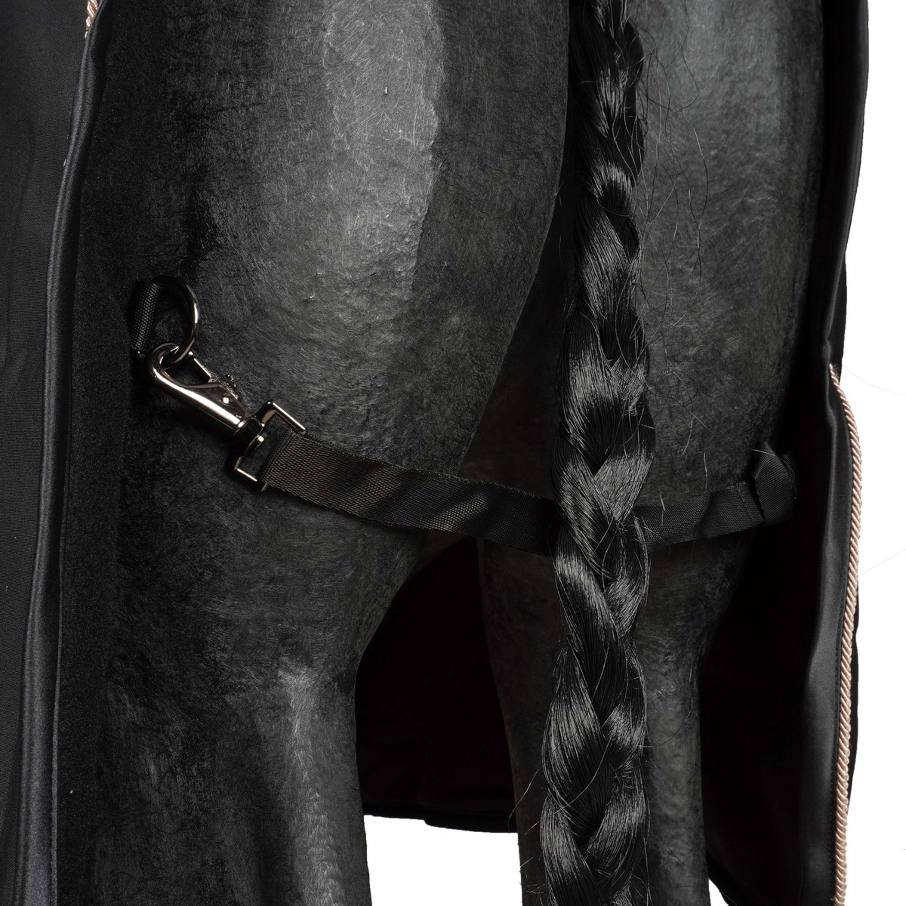 La coperta è rifinita con un cordoncino tono su tono e può essere fissata nella zona della coda con un cordoncino rimovibile, per una maggiore stabilità e per evitare che scivoli.