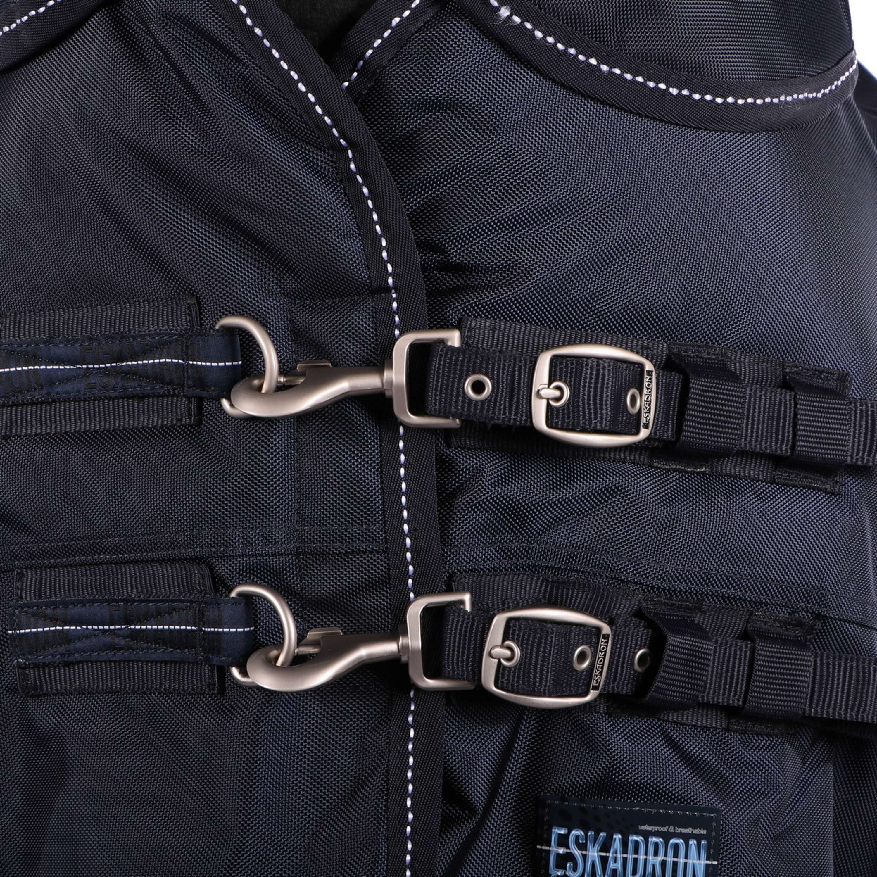 Grazie al suo design ben studiato e regolabile, questa coperta si adatta comodamente al corpo del cavallo, garantendo libertà di movimento senza sfregamenti o disagi. È una seconda pelle, ma molto più resistente.