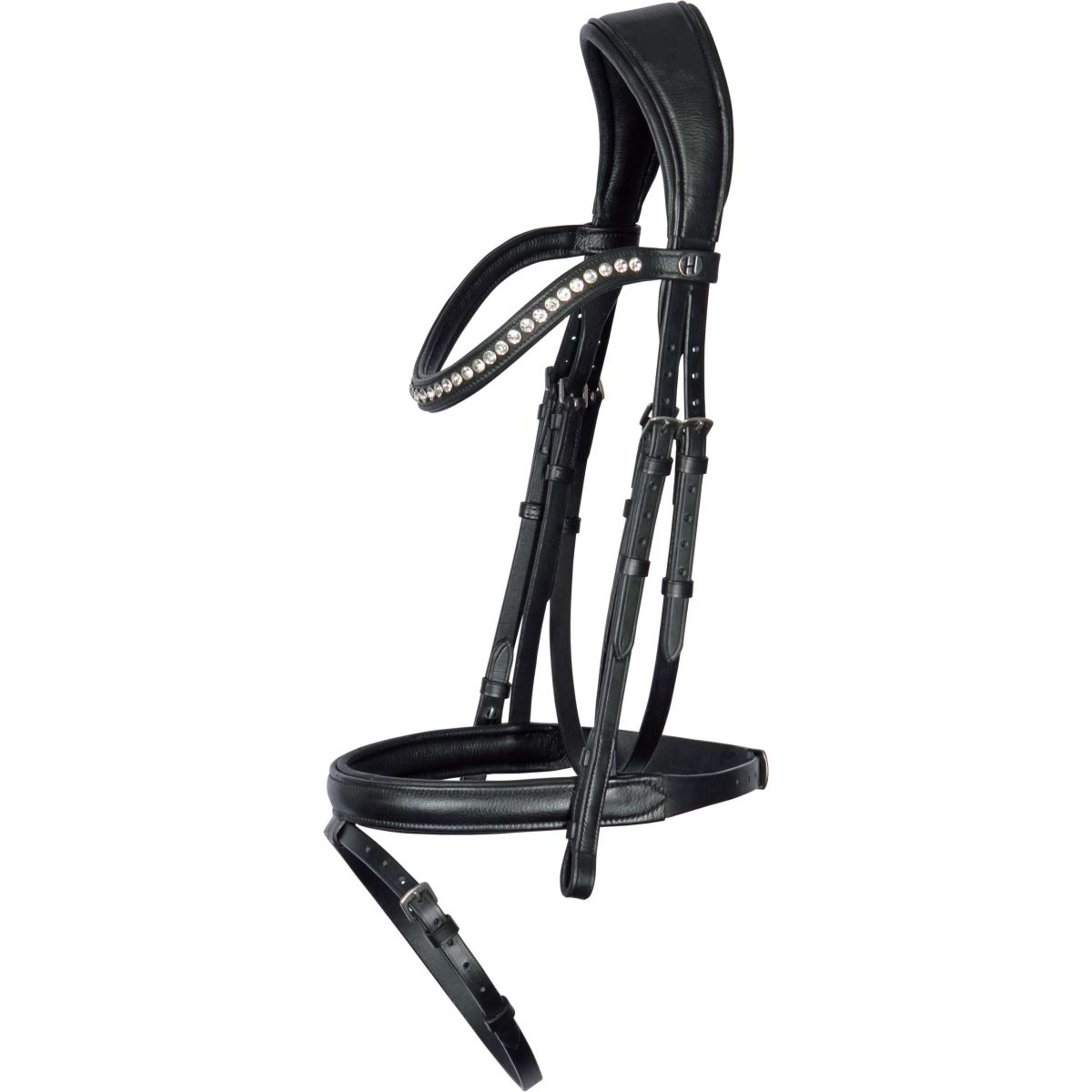 Briglia in cuoio extra morbida con sopratesta anatomico. Questa briglia è decorata con splendidi cristalli sul frontalino. Una briglia comoda può certamente contribuire a un maggiore comfort per il cavallo e quindi a migliorare le prestazioni. Dotata di frontalino pendente. Ciò contribuisce a ridurre la pressione sulle orecchie del cavallo. La capezzina è larga 2,7 cm, imbottitura inclusa. Chiusure nascoste su montanti e redini. La briglia è dotata di redini in tela.
