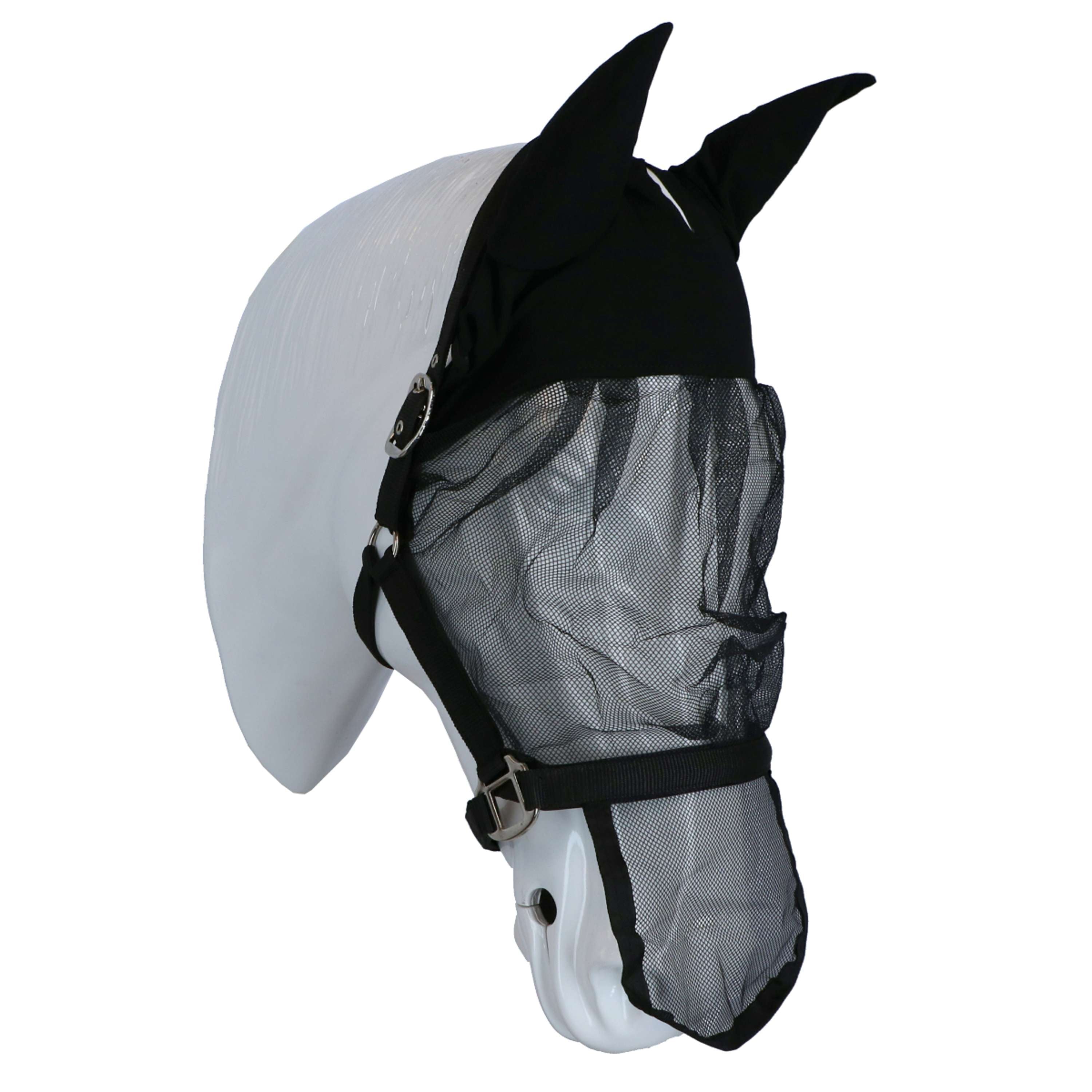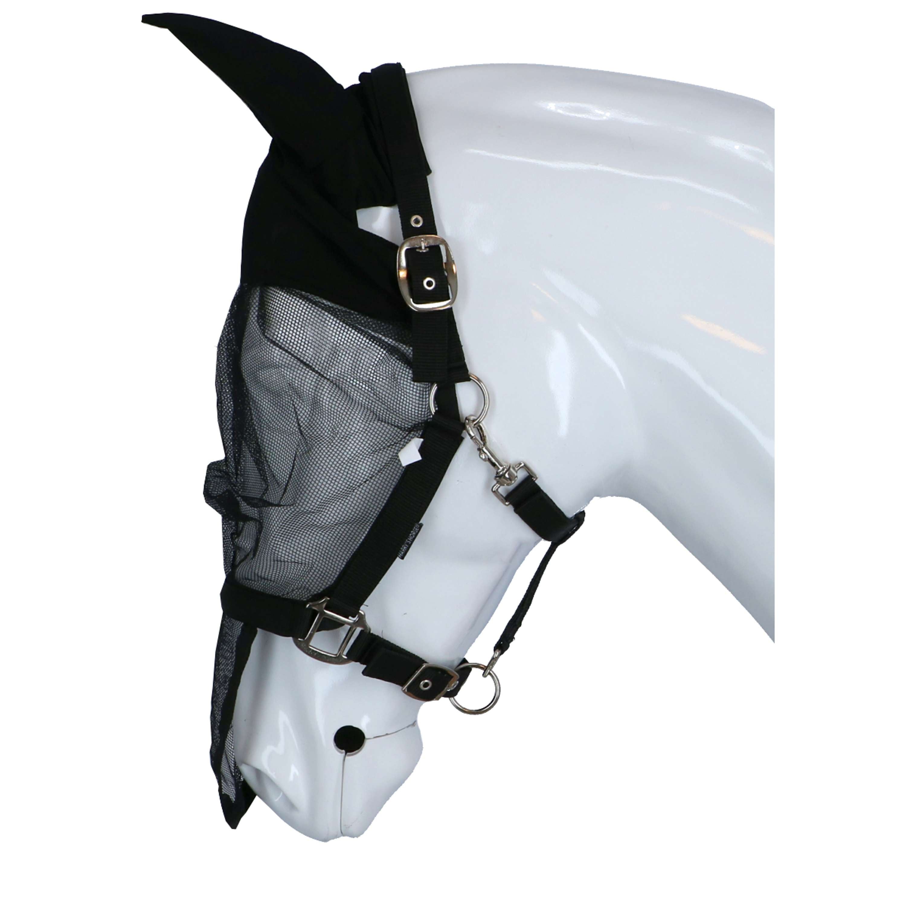 La cavezza con cappuccio anti-mosche è una cavezza con cappuccio anti-mosche a maglia fine. Presenta finiture color argento. Regolabile in tre punti: collo, gola e mascella. Gli occhielli sono dotati di anelli. Questo modello è dotato di orecchie. Completamente foderato in pelle scamosciata Domy. Materiale: polipropilene.