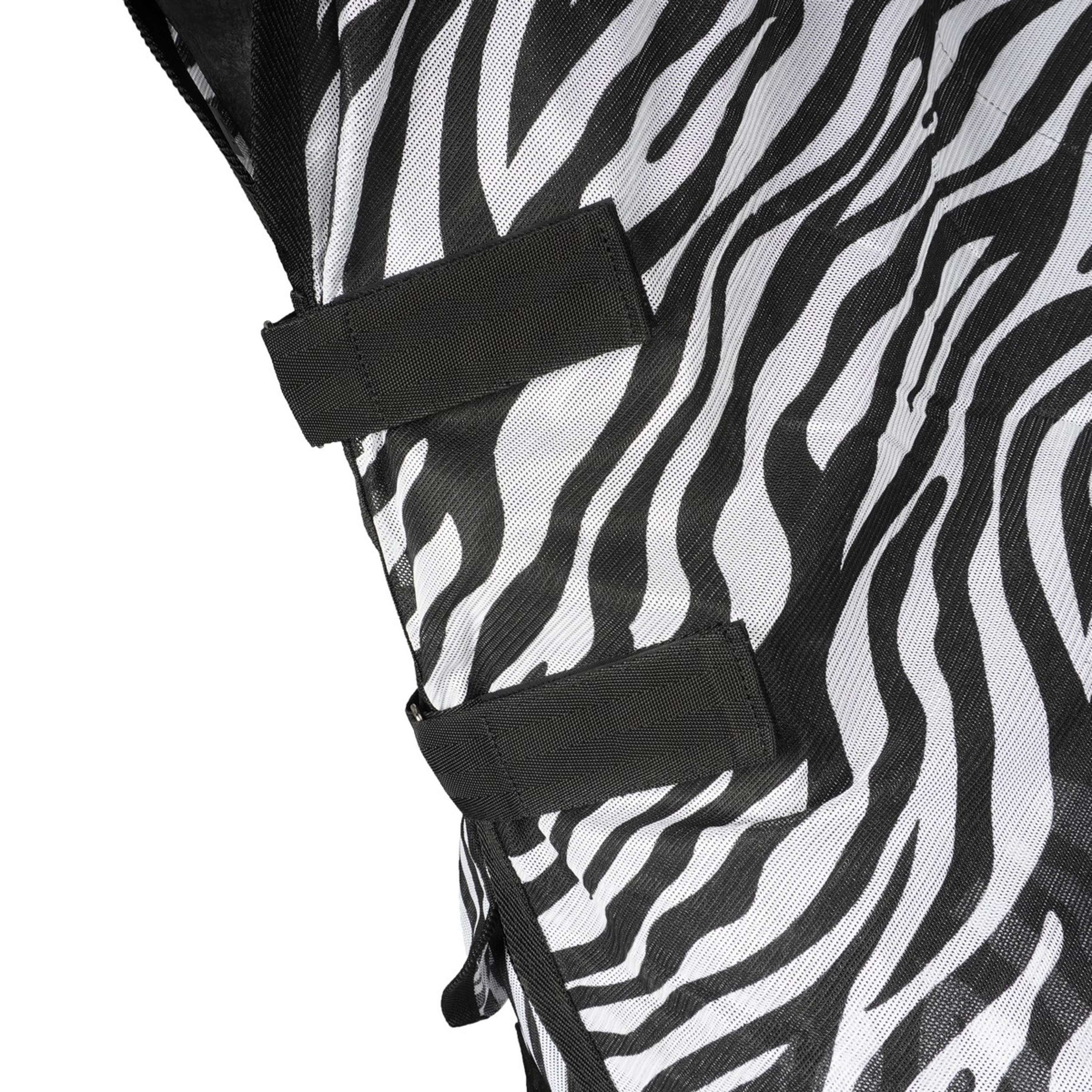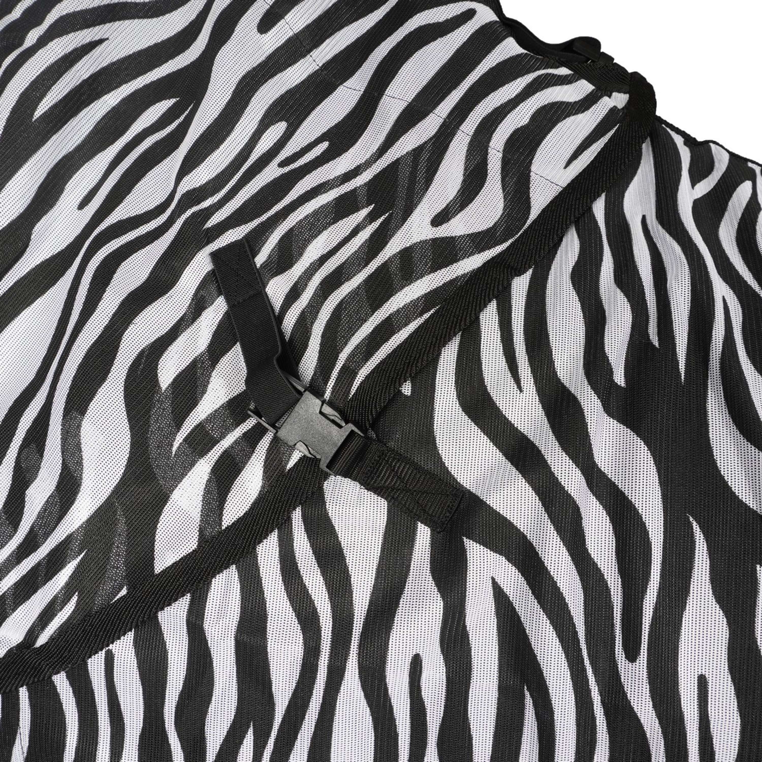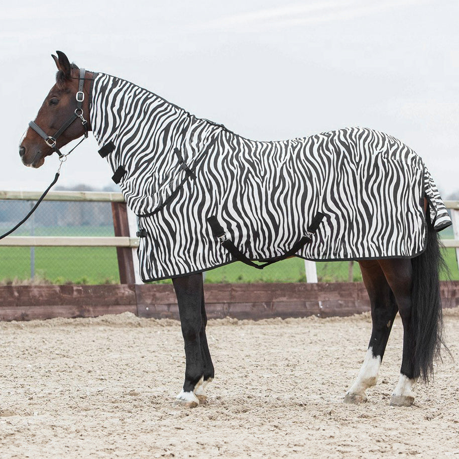 Coperta anti-mosche con collo rimovibile e stampa zebrata. Collo e coperta si chiudono rapidamente e facilmente con chiusure a clip. Include cinghie incrociate e cinturini per le zampe. 100% poliestere.