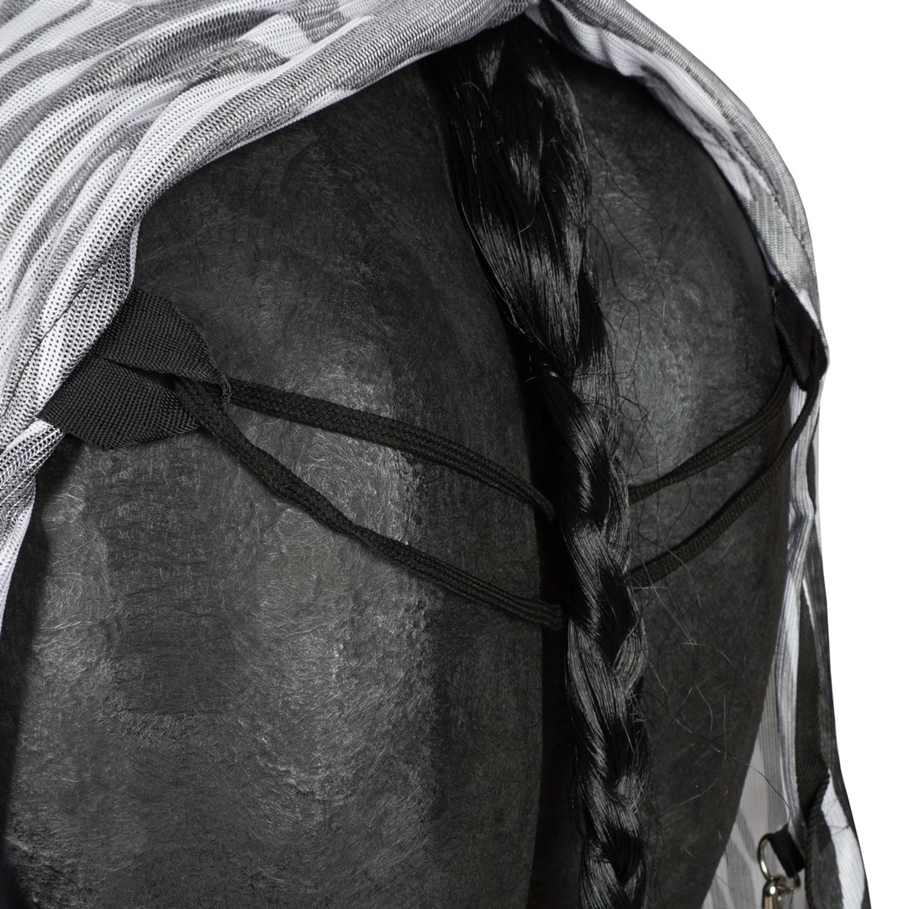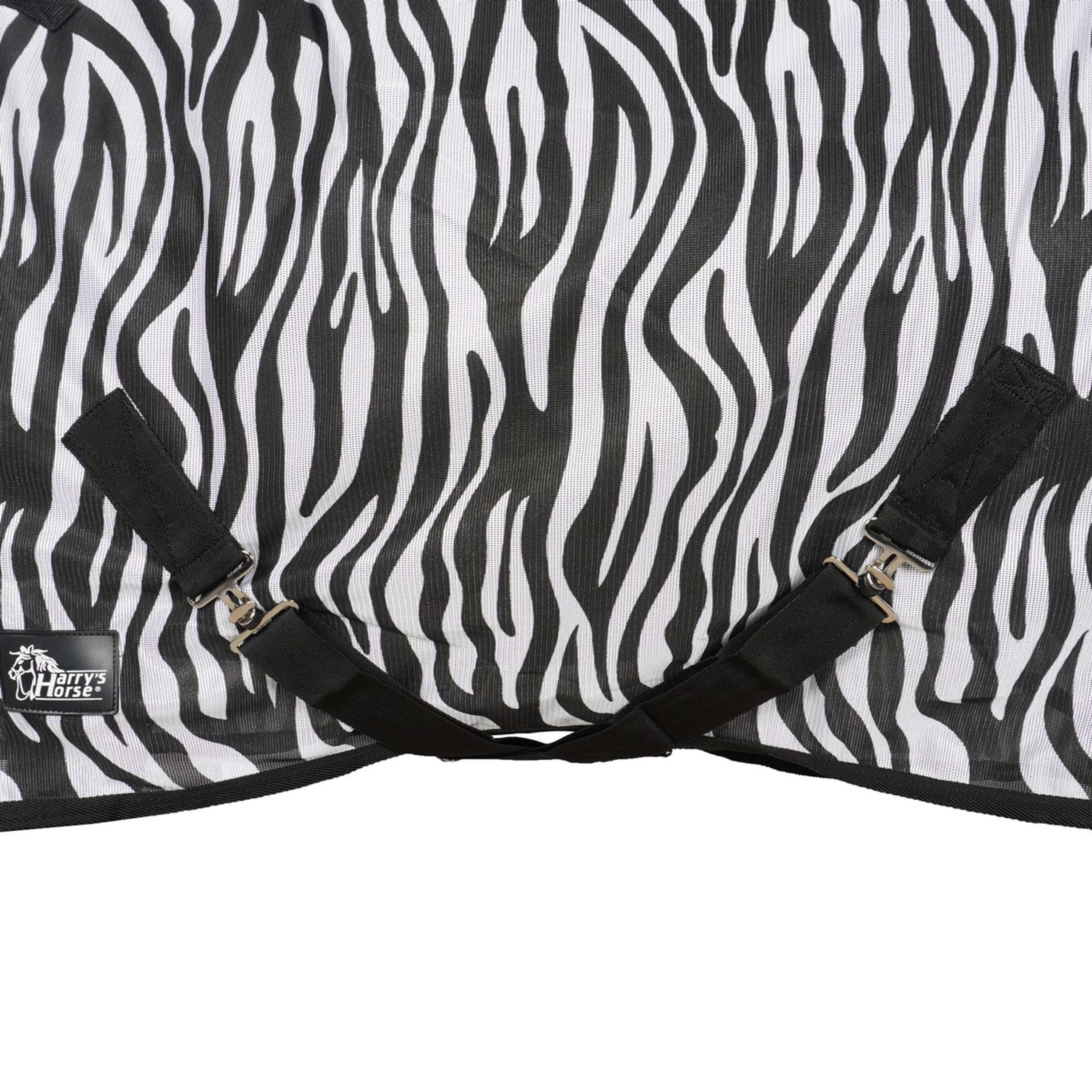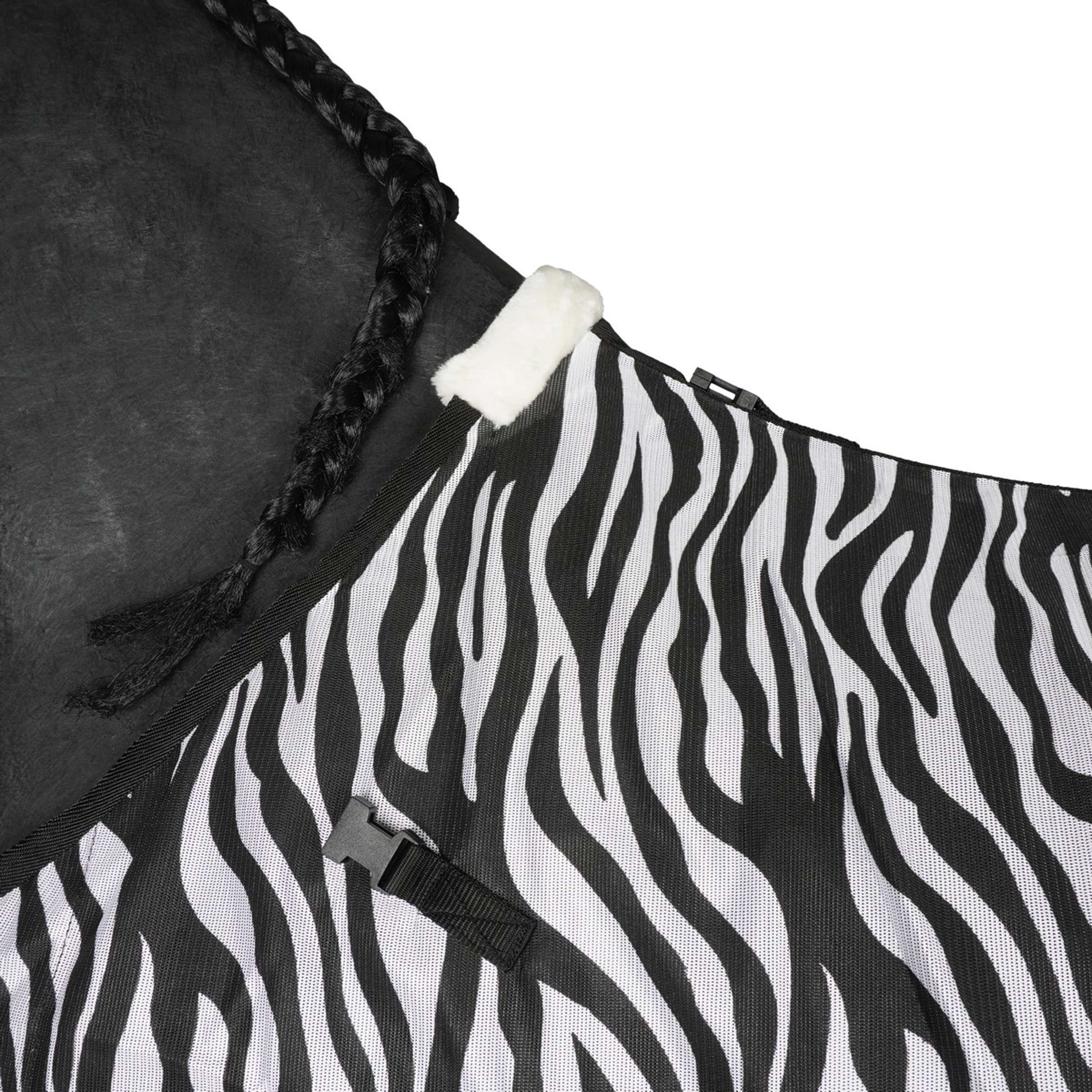 Coperta anti-mosche con collo rimovibile e stampa zebrata. Collo e coperta si chiudono rapidamente e facilmente con chiusure a clip. Include cinghie incrociate e cinturini per le zampe. 100% poliestere.