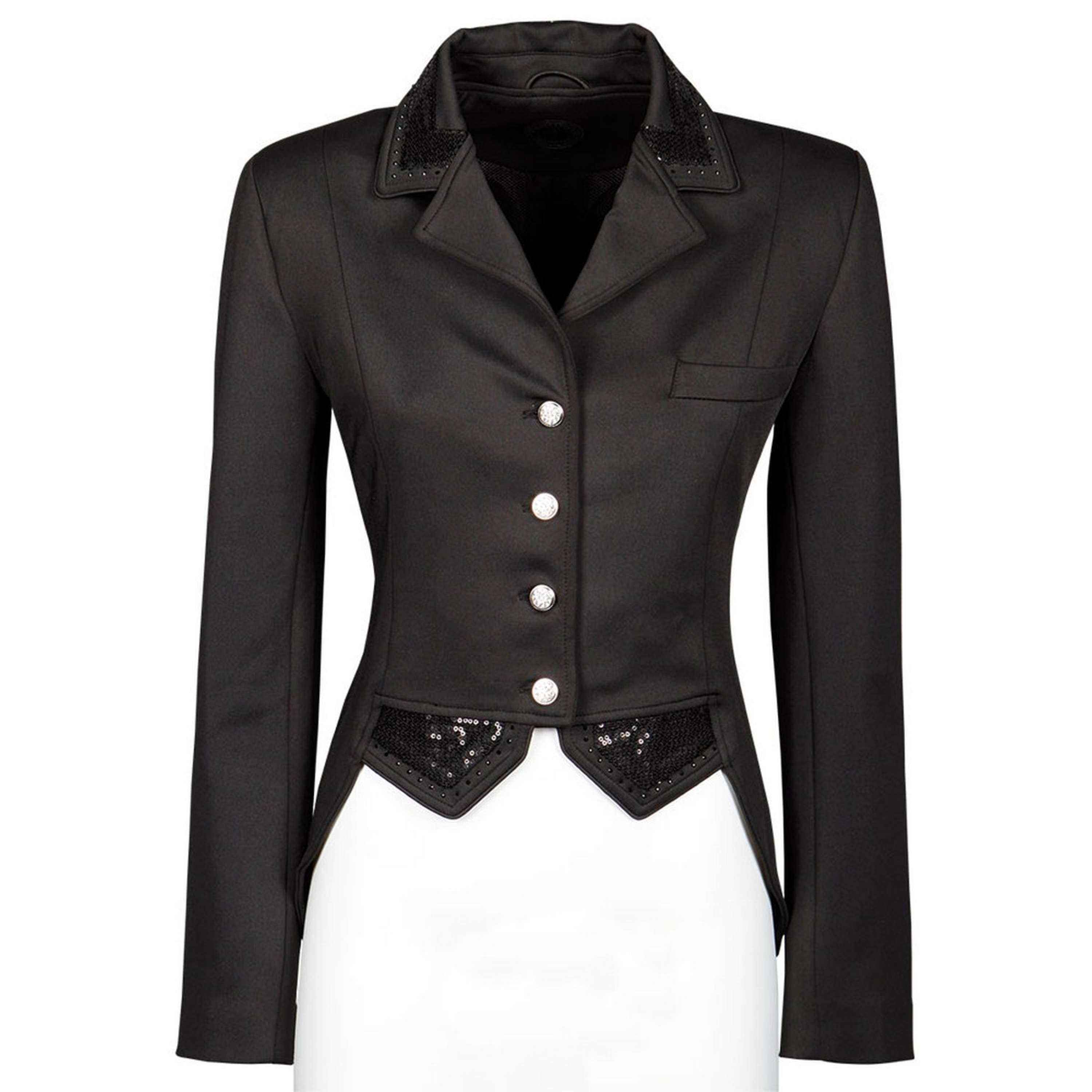 Lussuosa giacca da competizione realizzata in materiale elasticizzato di alta qualità. La giacca presenta una chiusura con bottoni in cristallo e una cerniera sottostante per una vestibilità perfetta. Il colletto e le patte del gilet sono decorati con paillettes/cristalli e profili tono su tono. Bottoni decorativi. 94% poliestere, 6% spandex.