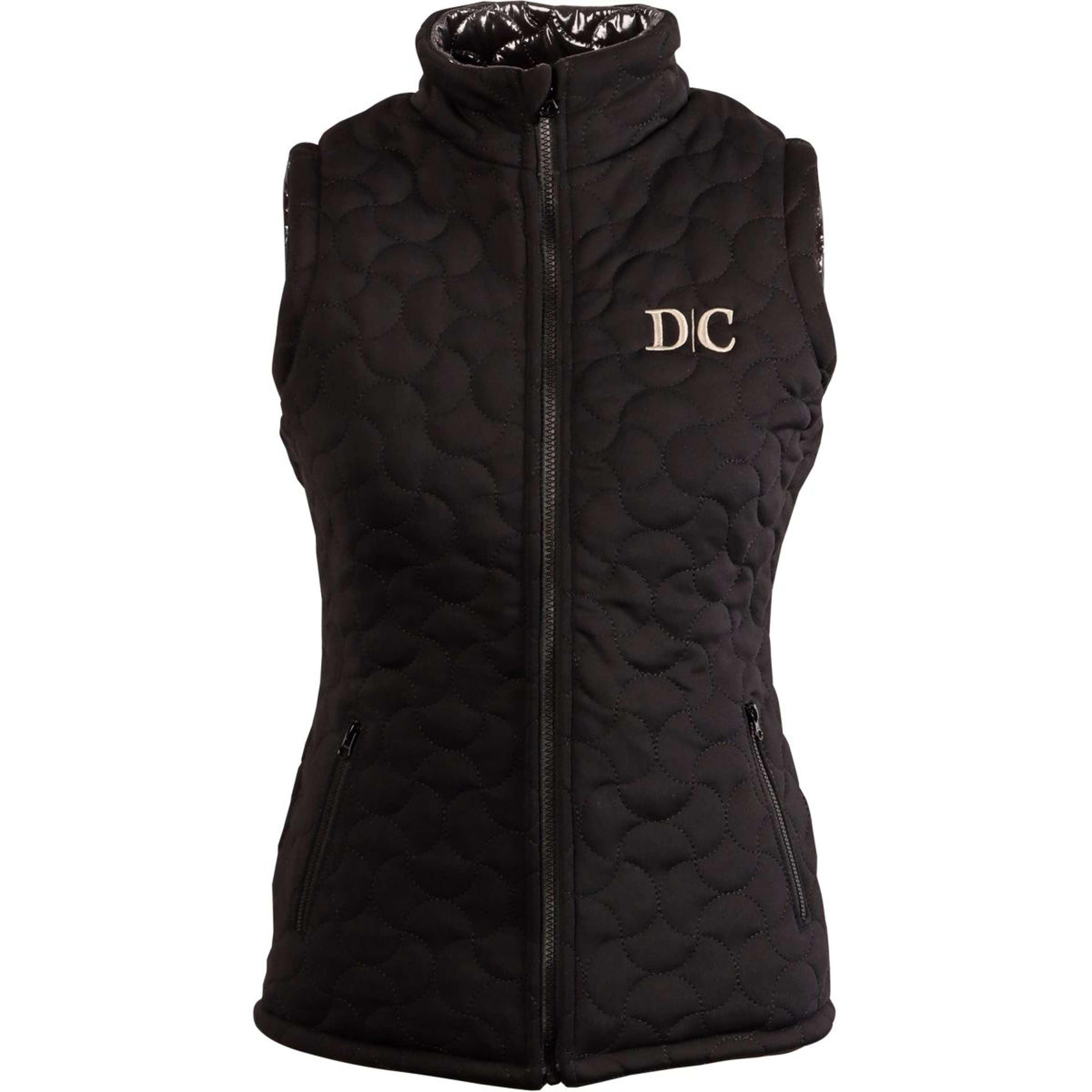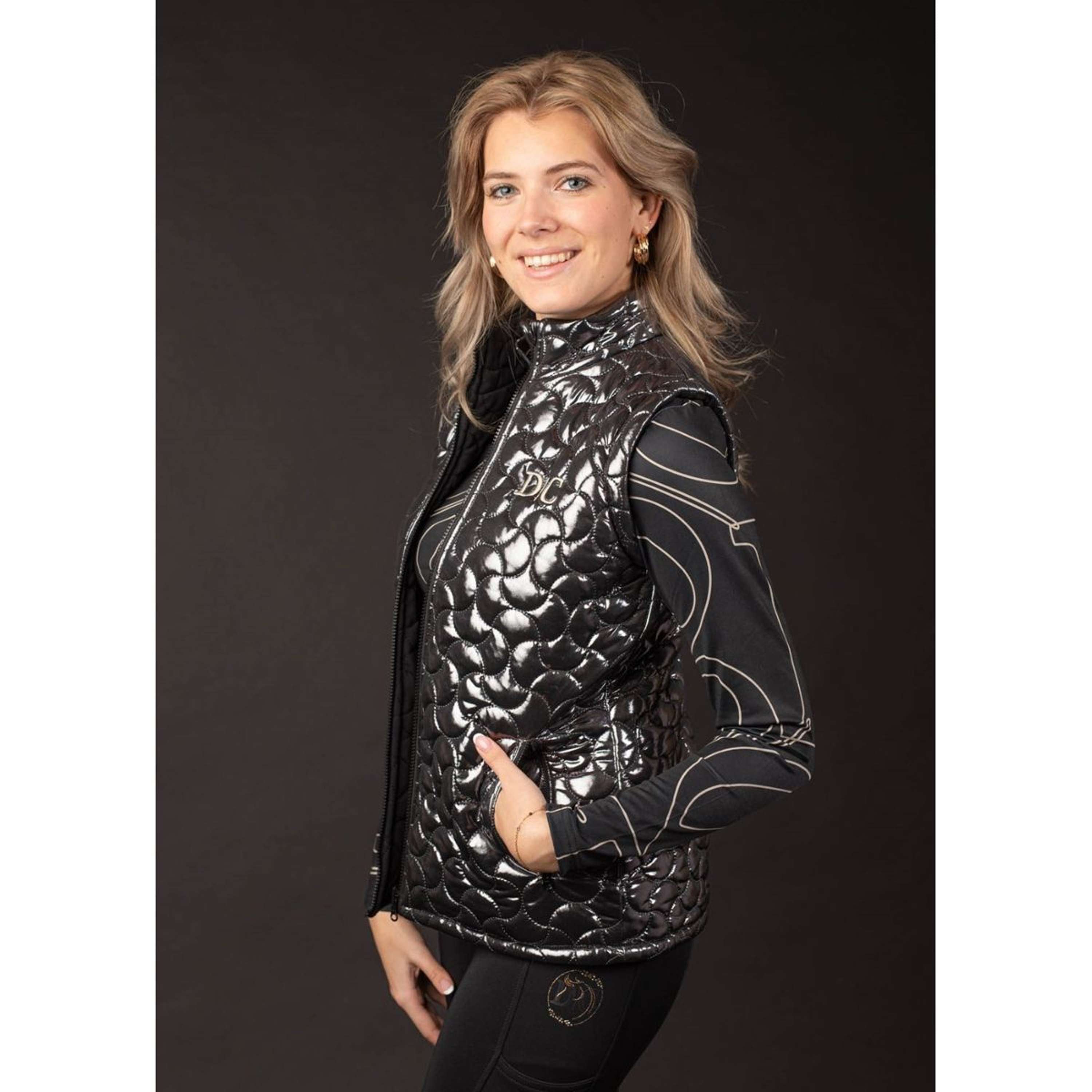 Gilet due in uno, indossabile con il lato nero o lucido, chiusura con zip a doppio cursore, due tasche con zip, ricamo Denici Cavalli su entrambi i lati.  Composizione: 100% poliestere e 94% poliestere / 6% elastan.