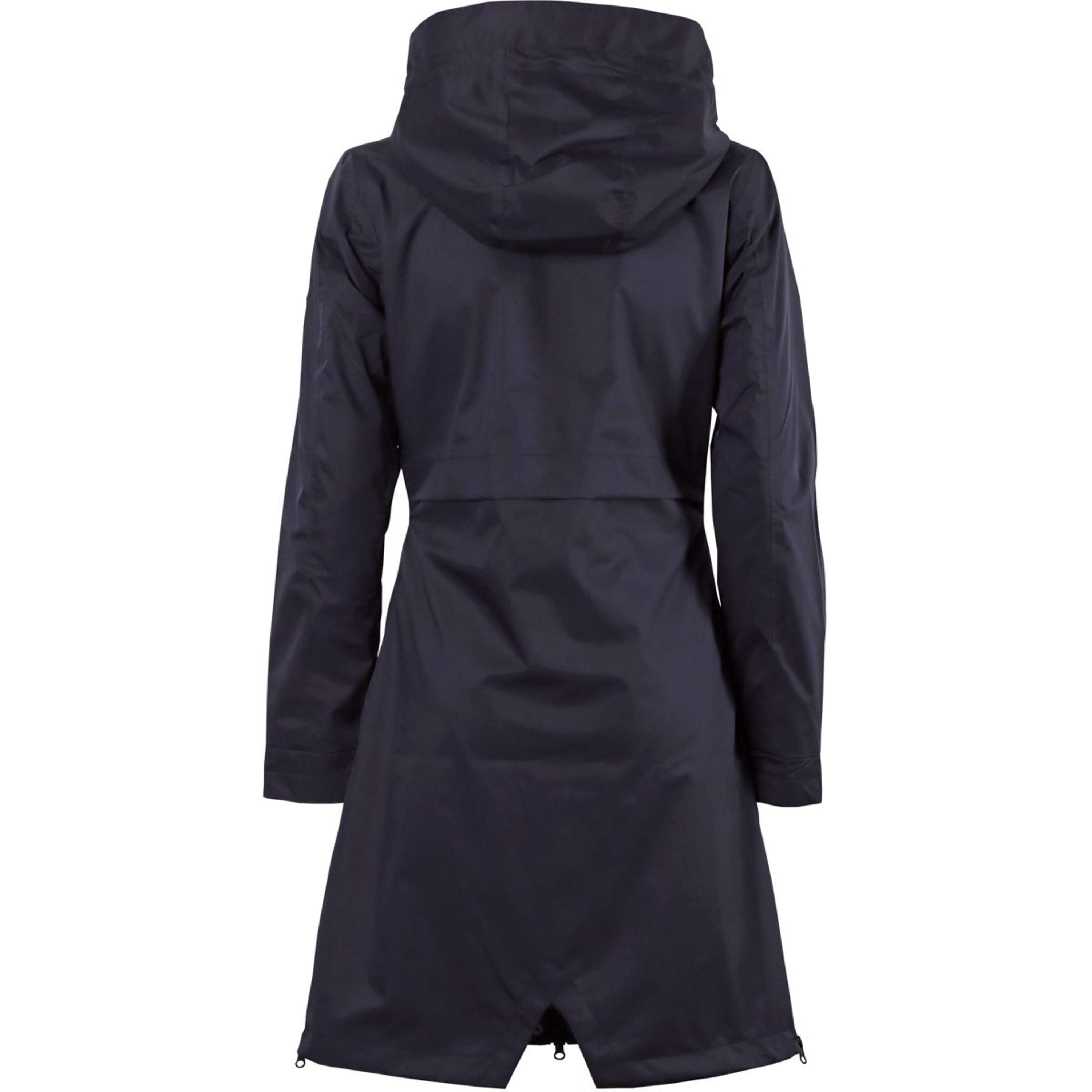 Cappotto lungo impermeabile e traspirante con cappuccio fisso, due tasche con bottoni automatici, una tasca interna con zip, chiusura con zip a doppio cursore e spacchi laterali con zip e inserti in tessuto. Un bottone automatico sul retro fissa il cappuccio. Materiale: 100% poliestere W/P 3000/3000, cuciture nastrate.