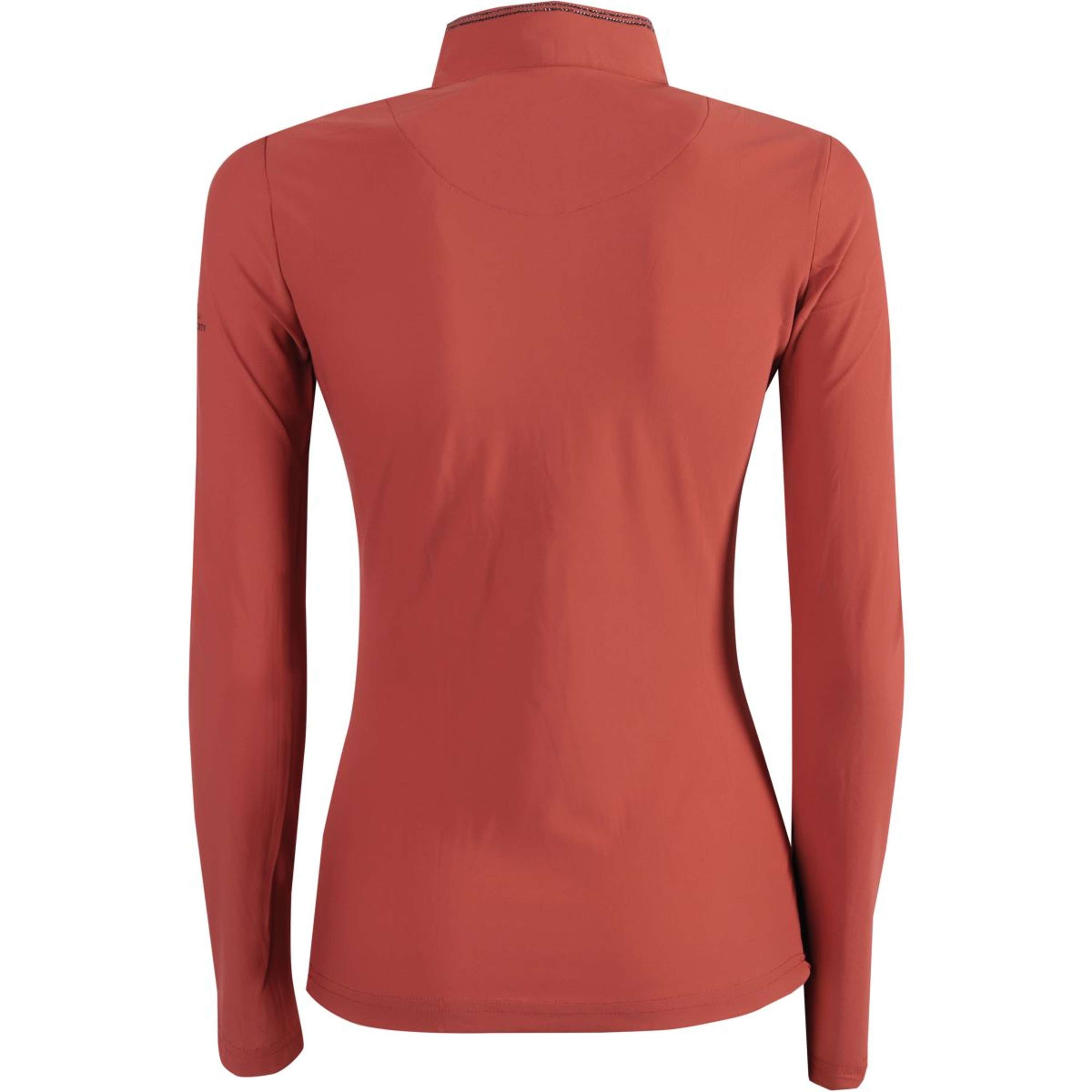 Maglietta a maniche lunghe con collo alto e cerniera corta, cristalli attorno al collo e lungo la cerniera e logo Equestrian Society sulla manica sinistra. Composizione: 80% cotone / 20% elastan.