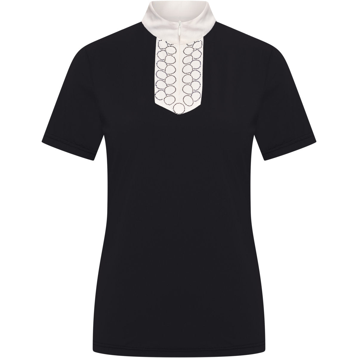 IRHShine Competition Shirt – Glamour, alla moda e comodaPronta a catturare la scena? Con la maglietta da competizione IRHShine sei garantito di essere il centro dell'attenzione nel dressage o nel salto da pista! Questo pezzo d'impatto combina senza sforzo design di alto livello con funzionalità, perfetto per chi vuole esprimere il proprio stile personale. Adorerai il colletto bianco impeccabile e il davanti abbinato, che brillano con un'esclusiva illustrazione bicolore in strass. Questo dà al tuo outfit da gara proprio quella dose extra di glamour per cui è famosa Imperial Riding! La pratica mezza cerniera davanti rende facile indossare e togliere le maniche, mentre le maniche corte ti danno tutta la libertà di movimento di cui hai bisogno. E naturalmente, il logo scintillante a strass sulla manica sinistra non dovrebbe mancare per sottolineare il tuo amore per la moda e l'equitazione. Osi brillare! Opere d'arte glamour con strass bicolore per un look scintillante. Colletto e davanti bianchi per un look classico e moderno. Mezza cerniera davanti per una comodità facile e un comfort extra. Maniche corte che offrono la massima libertà di movimento durante ogni uscita. Un sottile logo di strass sulla manica sinistra come tocco finale.
