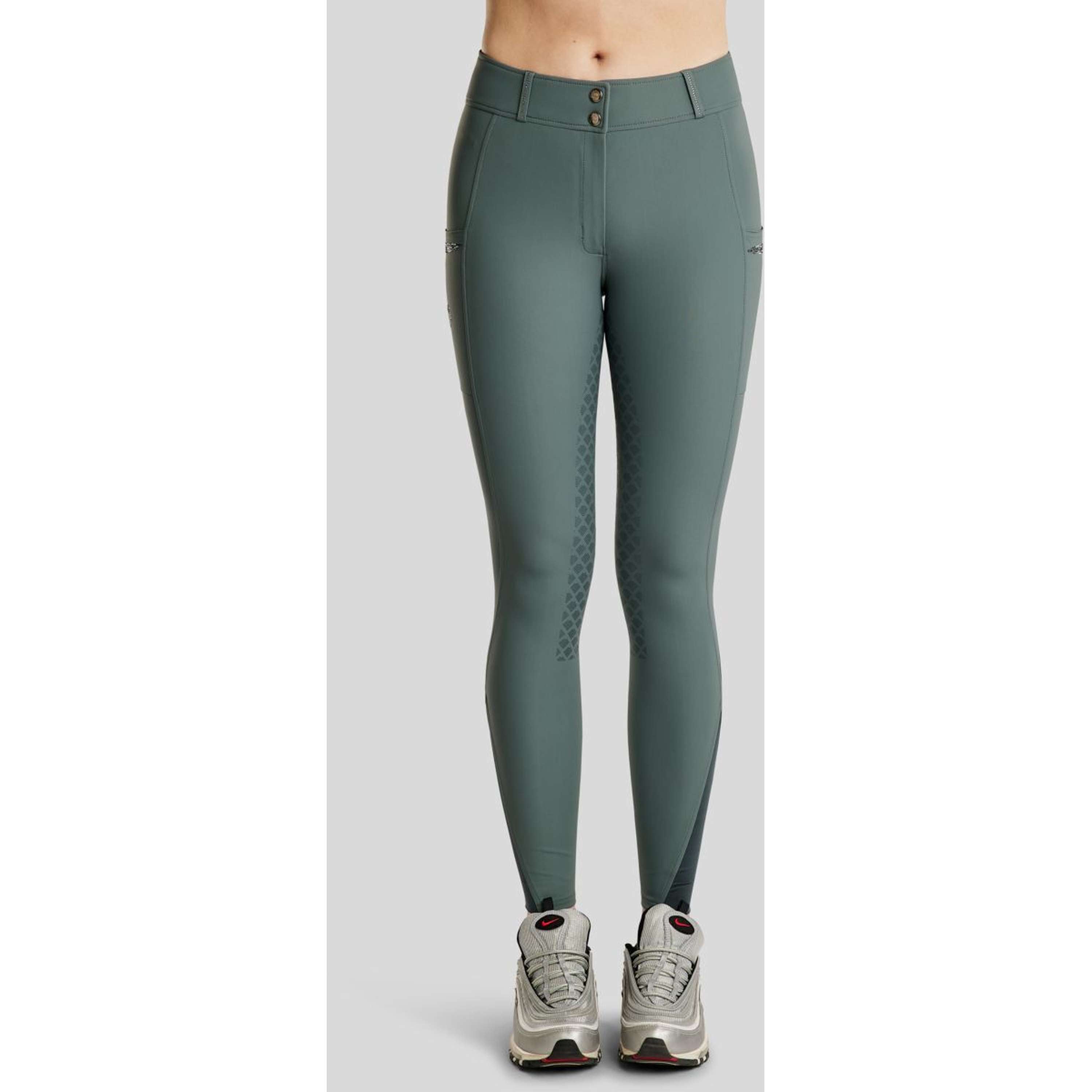 Aggiungi un tocco di eleganza al tuo guardaroba da equitazione con i pantaloni MoEmilia Breeches, caratterizzati da un mix di cristalli nei toni del grigio. Questi eleganti pantaloni con grip integrale sono pensati per il cavaliere che desidera combinare funzionalità con dettagli lussuosi e femminili. Design elegante e sofisticato: i pantaloni presentano un look accattivante e accattivante con due pratiche tasche portacellulare, ciascuna decorata con un mix di cristalli nei toni del grigio. Inoltre, uno scintillante logo Montar in cristalli aggiunge un dettaglio esclusivo che risalta e ne esalta l'aspetto elegante. Caratteristiche funzionali: • Grip integrale: garantisce una tenuta e una stabilità ottimali in sella. • Due tasche portacellulare: posizionate sulle cosce e decorate con cristalli per funzionalità e stile. • Esclusivo logo Montar in cristalli: aggiunge una finitura femminile e raffinata. • Vestibilità aderente e comfort elevato: ideali sia per l'allenamento che per l'uso quotidiano. Materiale unico per il massimo comfort: i pantaloni sono realizzati con una miscela di materiali che combinano resistenza, elasticità e comfort morbido. Il tessuto esterno è resistente e flessibile, mentre il tessuto interno è morbido e liscio sulla pelle.Materiale:• Esterno: 78% poliammide, 22% elastan• Interno: 92% poliestere, 8% elastan
