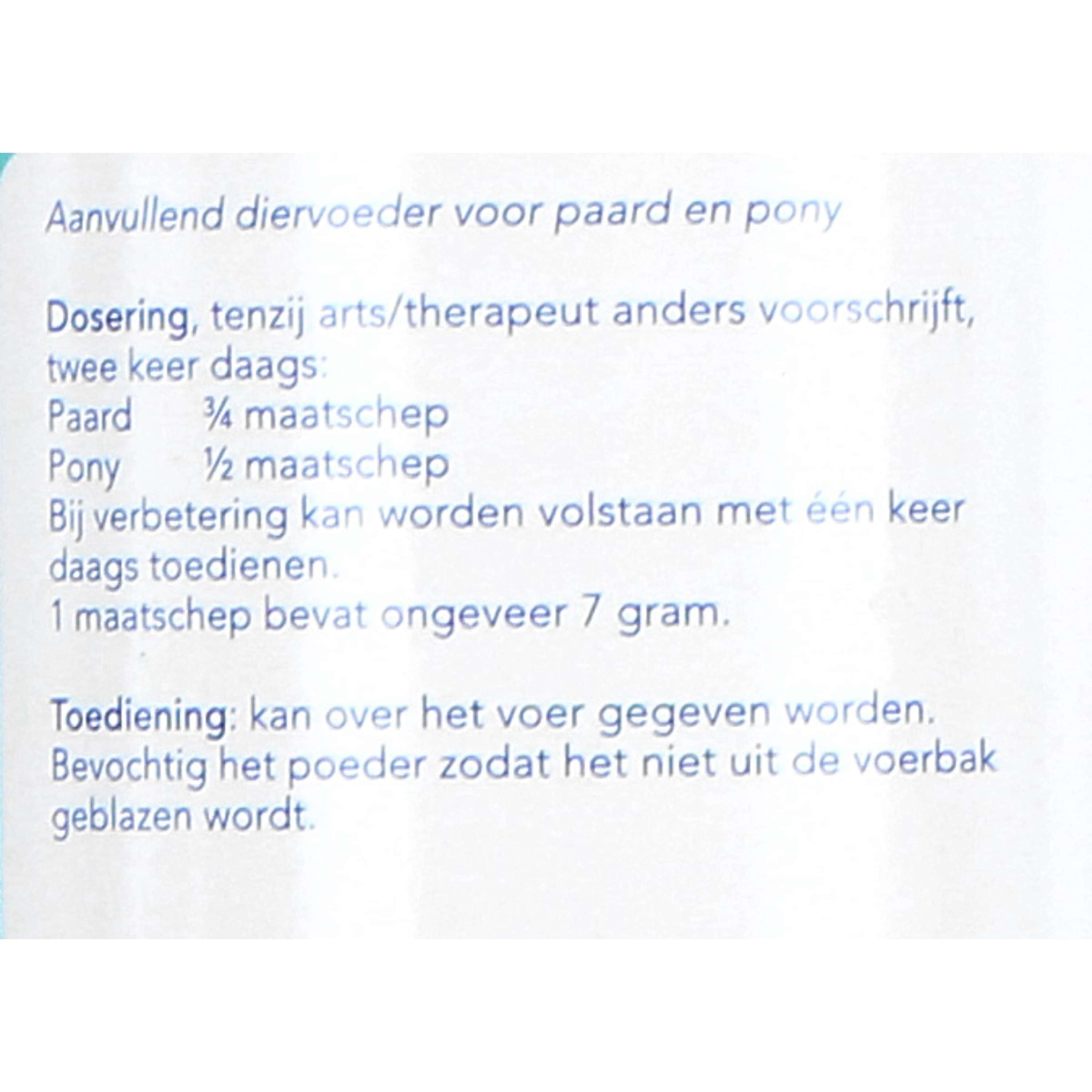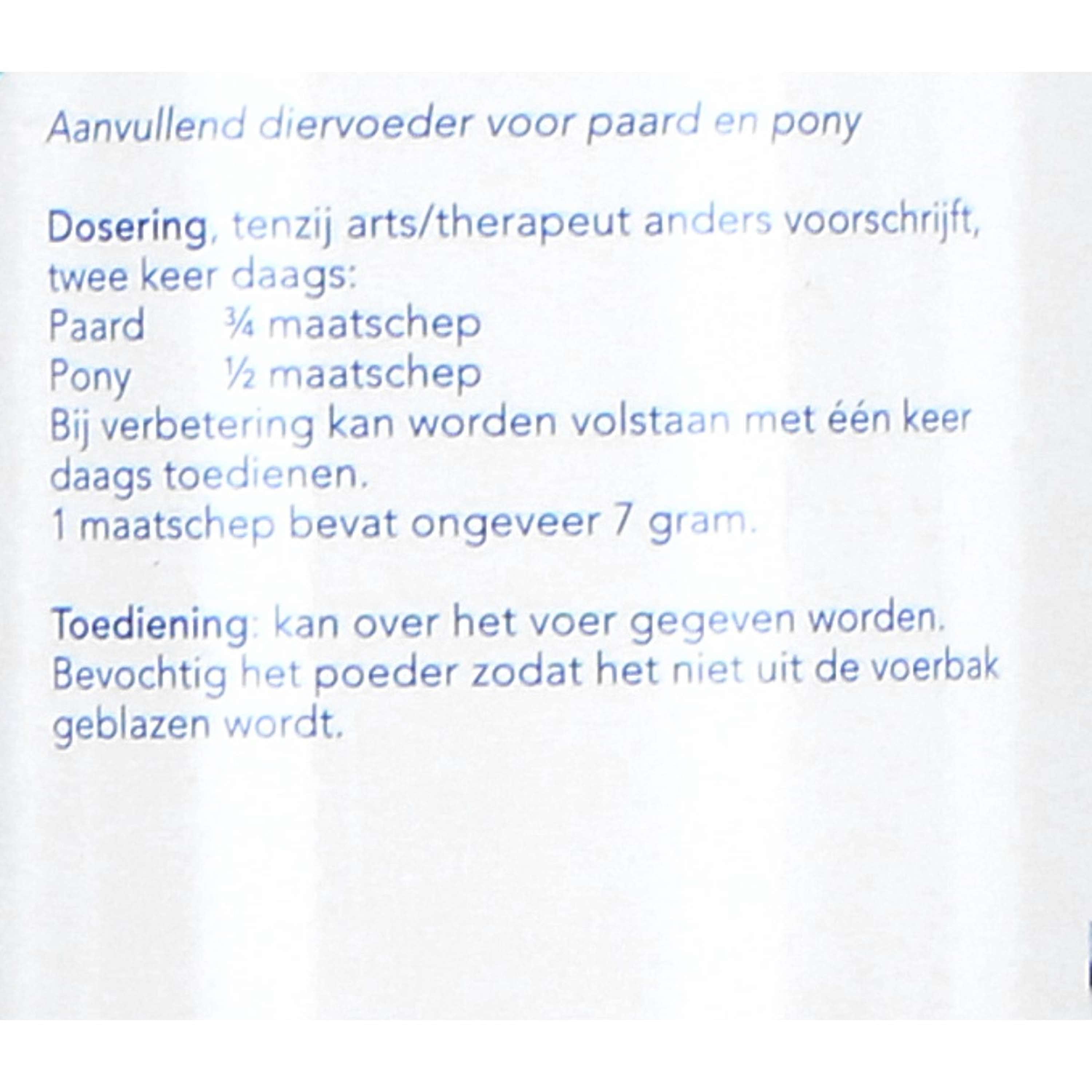 Naturalmente, anche in questo caso è opportuno integrare la dose secondo necessità. Osservare attentamente la reazione alle gocce e, se necessario, regolare il dosaggio. Salvo diversa prescrizione medica o terapeutica, due volte al giorno: Pony 1/2 misurino Cavallo 3/4 misurino Un misurino per cavallo e pony contiene circa 7 grammi. Se nella pratica è difficile somministrare questo prodotto più volte al giorno, è sufficiente una volta al giorno o una volta ogni 2 giorni. In tal caso, somministrare il dosaggio massimo per un giorno. Anche in questo caso, questo prodotto può essere utilizzato efficacemente, ma la reazione potrebbe richiedere un po' più di tempo.