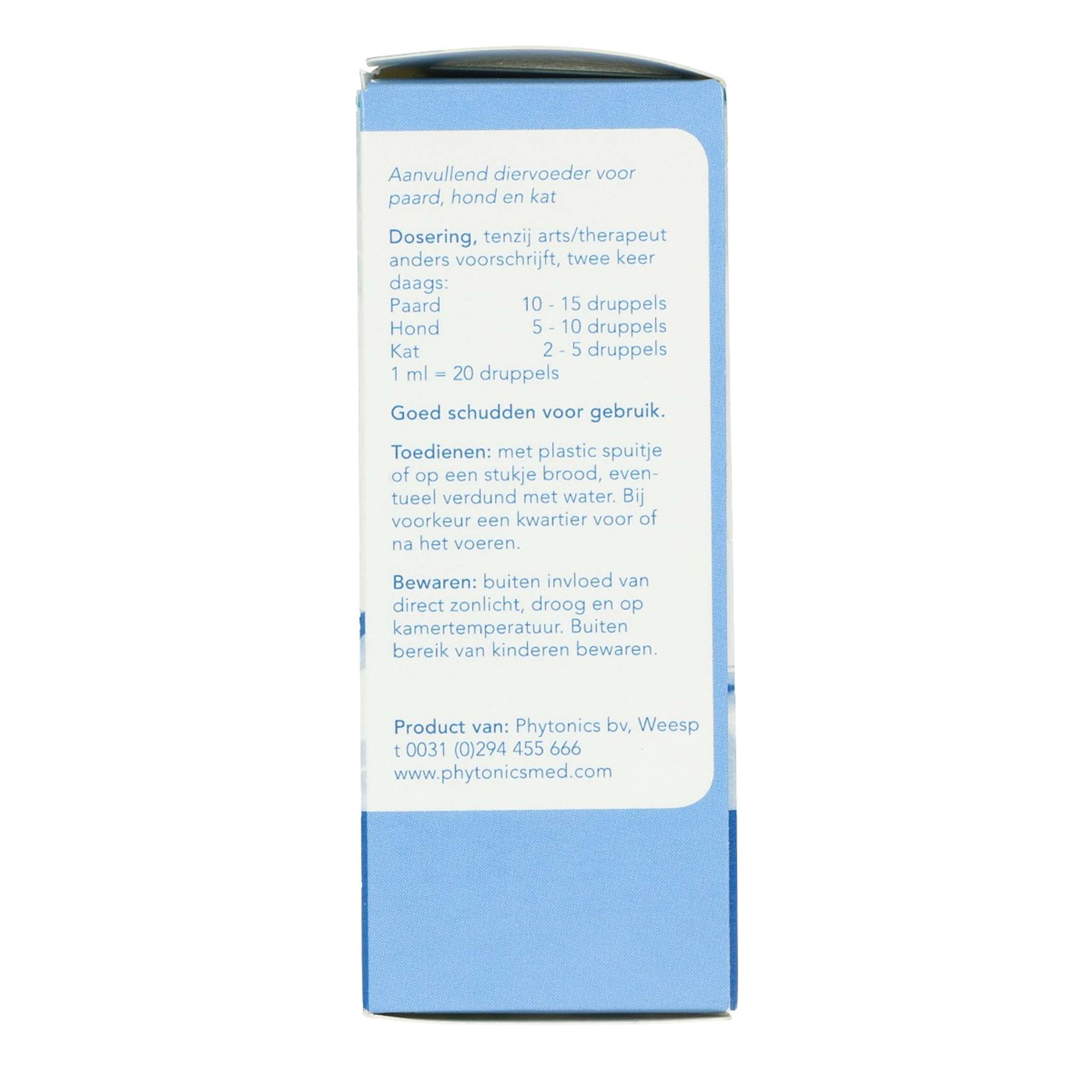 Diversi prodotti della serie Phytonics sono disponibili in confezioni veterinarie (blu) e umane (verde). Lanciati nel 2010 per gli animali, gli stessi prodotti sono diventati rapidamente richiesti anche per gli esseri umani. Il contenuto è lo stesso, solo l'etichettatura differisce a causa delle normative vigenti. In futuro, vorremmo semplificare questo aspetto e scegliere un'etichetta veterinaria o umanitaria. All'interno della linea Phytonics, tutti gli ingredienti sono di qualità umana. I prodotti fitoterapici sono adatti a qualsiasi essere vivente. Come regola generale, la sensibilità a queste sostanze è la stessa per esseri umani e cavalli, indipendentemente dal loro peso. Il dosaggio per gli adulti è lo stesso di quello per i cavalli. Il dosaggio per i bambini di età compresa tra 6 e 12 anni è adatto a cani e gatti. Naturalmente, è necessaria anche l'integrazione, se necessario. Monitorare attentamente la reazione dell'animale alle gocce e regolare il dosaggio se necessario.