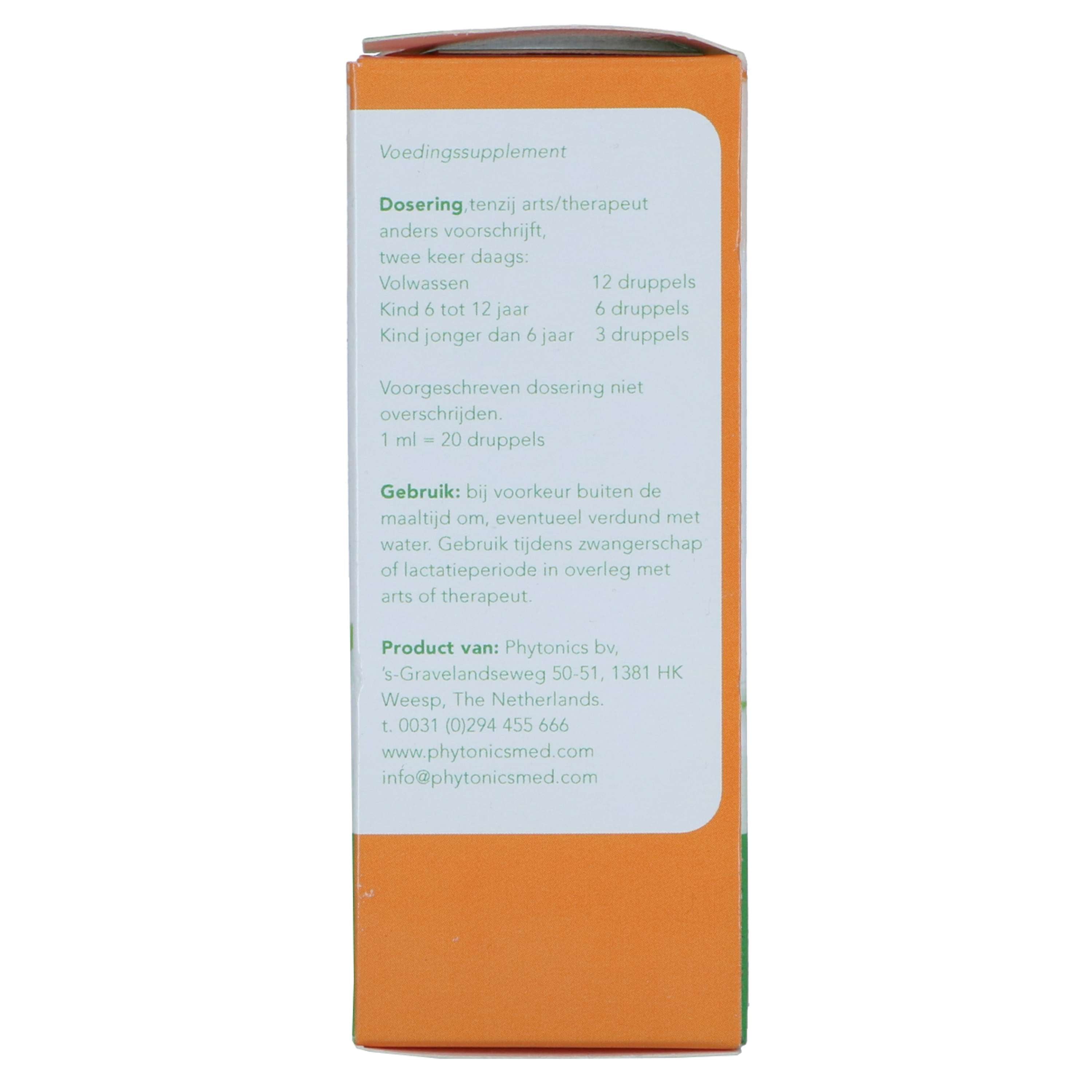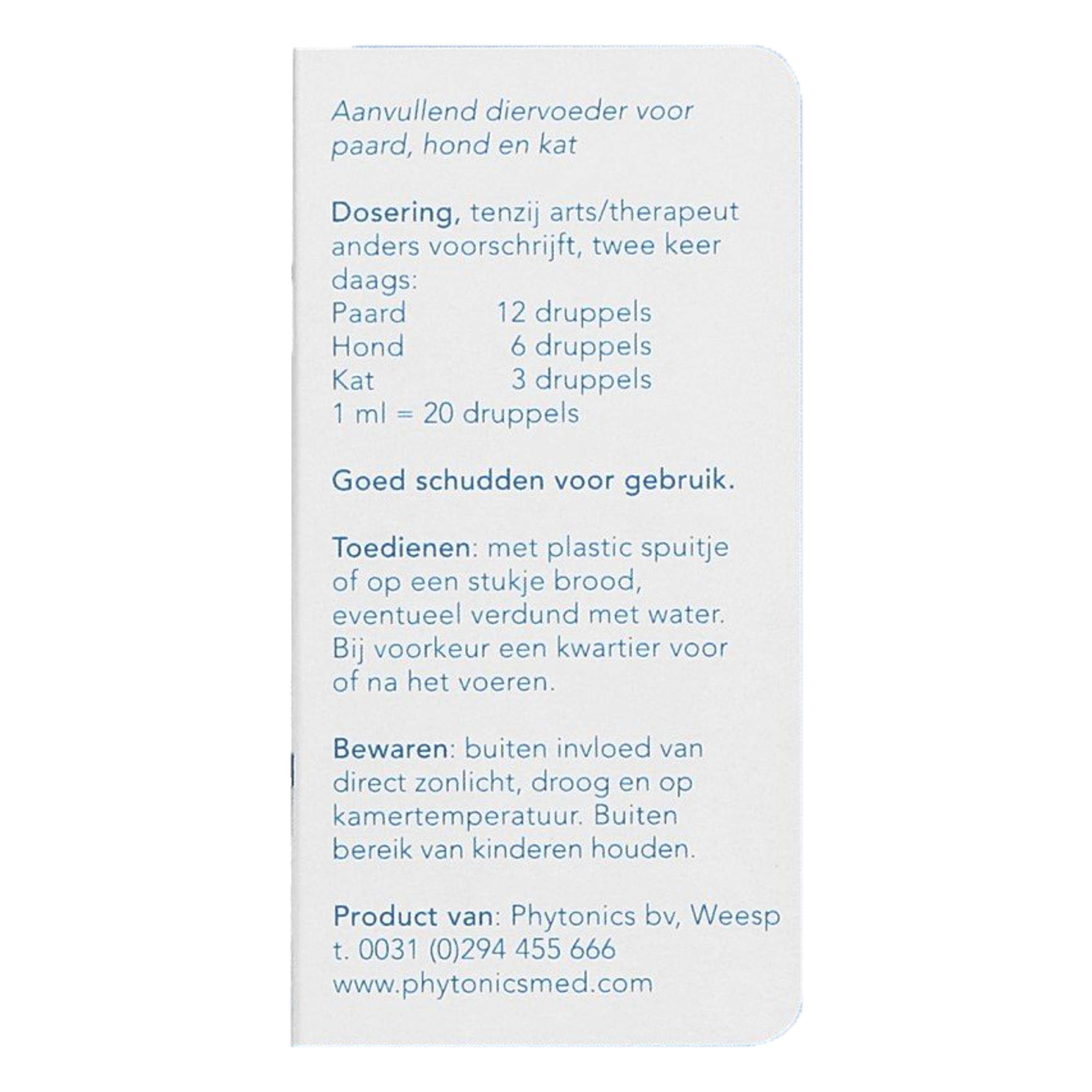Diversi prodotti della serie Phytonics sono disponibili in confezioni veterinarie (blu) e umane (verde). Lanciati nel 2010 per gli animali, gli stessi prodotti sono diventati rapidamente richiesti anche per gli esseri umani. Il contenuto è lo stesso, solo l'etichettatura differisce a causa delle normative applicabili. In futuro, vorremmo semplificare questo aspetto e scegliere un'etichetta veterinaria o umanitaria. All'interno della serie Phytonics, tutti gli ingredienti sono di qualità umana. I prodotti fitoterapici sono adatti a qualsiasi essere vivente. Come regola generale, la sensibilità a queste sostanze è la stessa per esseri umani e cavalli, indipendentemente dal loro peso. Il dosaggio per gli adulti è lo stesso di quello per i cavalli. Il dosaggio per i bambini dai 6 ai 12 anni è adatto a cani e gatti. Naturalmente, è necessaria anche l'integrazione, se necessario. Osservare attentamente la reazione del paziente alle gocce e regolare il dosaggio se necessario. Integratore alimentare: salvo diversa prescrizione medica/terapeuta, due volte al giorno: