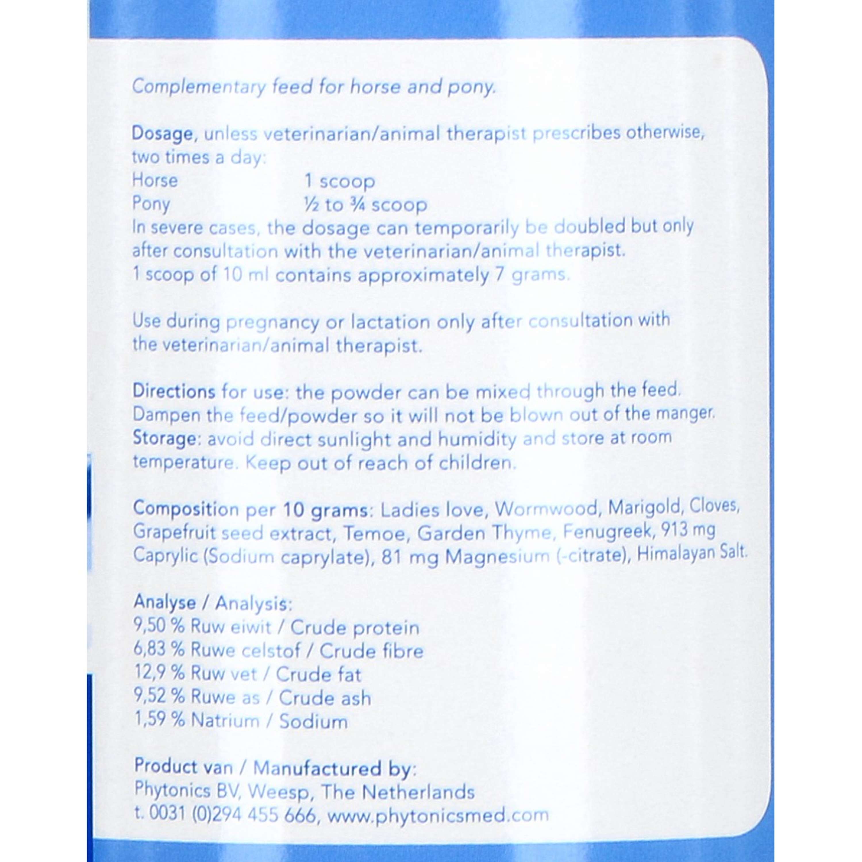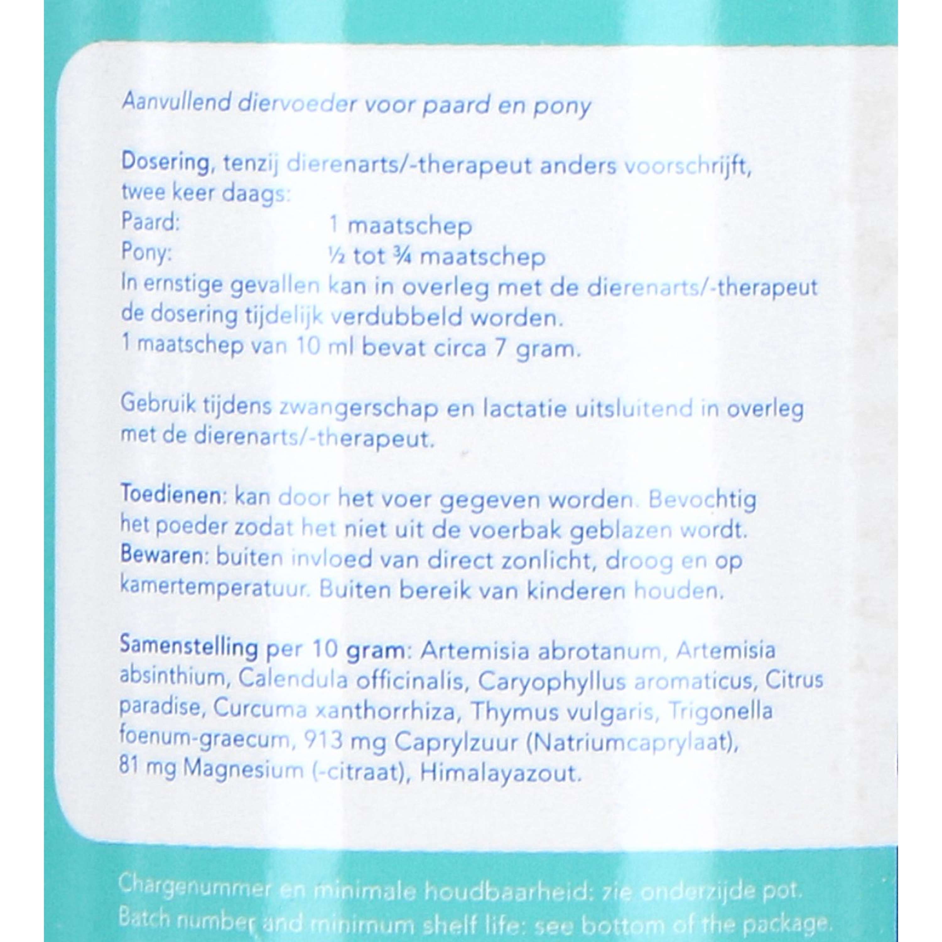 Al miglioramento, è possibile utilizzare una dose di mantenimento. Questa è solitamente la metà del dosaggio indicato sulla confezione. Quando si somministra questo prodotto, osservare attentamente la reazione dell'animale. Inizialmente potrebbe essere necessario un dosaggio maggiore; questo prodotto può essere somministrato in sicurezza a una dose doppia. Al miglioramento, ridurre gradualmente il dosaggio alla dose minima possibile. Può essere somministrato sopra il cibo. Inumidire (cibo secco) il cibo/la polvere in modo che non venga soffiato fuori dalla ciotola. Assenzio (Artemisia absinthium), Estratto di semi di pompelmo (Citrus paradisi), Curcuma (Curcuma xanthorrhiza), Chiodi di garofano (Caryophyllus aromaticus), Timo (Thymus vulgaris), Fieno greco (Trigonella foenumgraecum), Acido caprilico (come caprilato di sodio), Estratto di calendula (Calendula officinalis), Magnesio (come citrato), Sale dell'Himalaya.