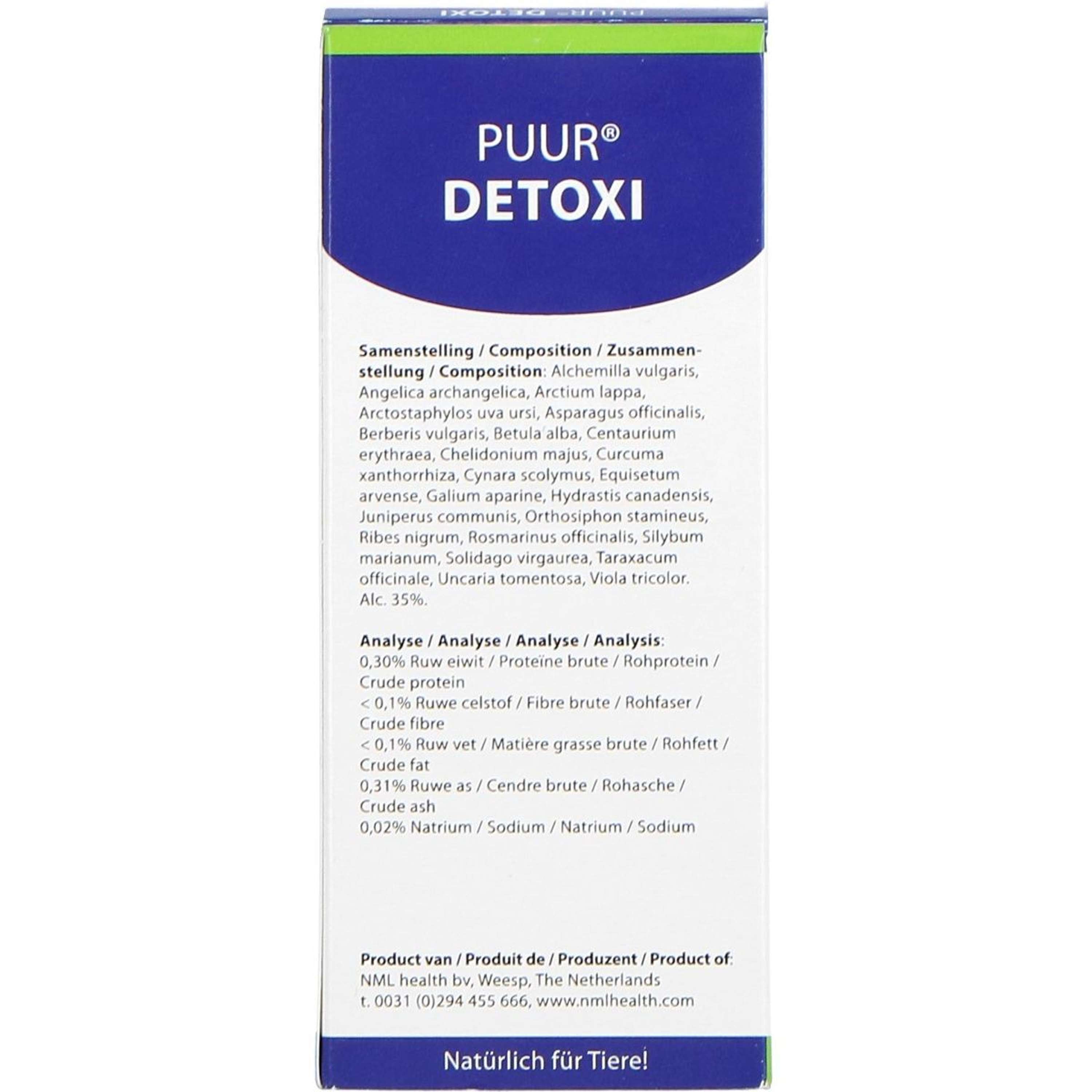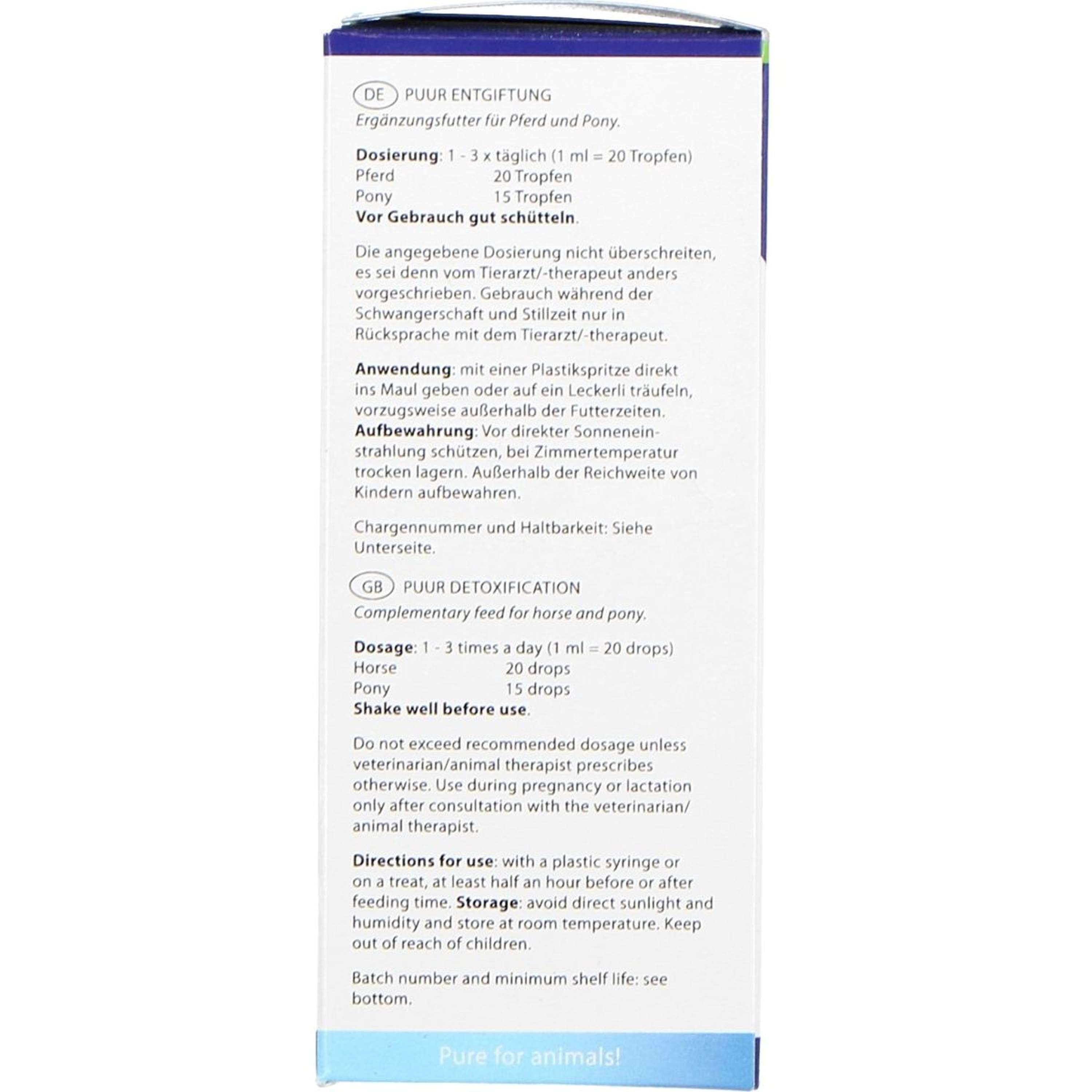 Agitare bene prima dell'uso. Se nella pratica è difficile somministrare PUUR Detoxi più volte al giorno, è sufficiente una volta al giorno o una volta ogni due giorni. In tal caso, somministrare il dosaggio massimo per un giorno. Questo prodotto può essere utilizzato ancora efficacemente, ma la reazione potrebbe richiedere un po' più di tempo. In caso di miglioramento, è possibile utilizzare una dose di mantenimento. Questa è solitamente la metà del dosaggio indicato sulla confezione. Quando si somministra PUUR Detoxi, monitorare attentamente la reazione dell'animale. Inizialmente potrebbe essere necessario un dosaggio più elevato; Questo prodotto può essere somministrato in sicurezza a una dose doppia. Ridurre gradualmente il dosaggio alla dose minima possibile non appena si nota un miglioramento. Con alcune diluizioni ed estratti, potrebbe verificarsi un breve peggioramento all'inizio del trattamento. Ciò significa che l'animale sta reagendo al prodotto. In caso di aumento significativo, dimezzare il dosaggio o interrompere temporaneamente la somministrazione e quindi aumentarlo gradualmente. Somministrare questo prodotto direttamente in bocca utilizzando una siringa di plastica, diluito con un po' d'acqua se necessario. Preferibilmente non durante i pasti, poiché il prodotto agisce meglio se assorbito attraverso la mucosa orale pulita. Se ad un animale non piace il prodotto, le gocce possono essere somministrate su un pezzetto di bocconcino.