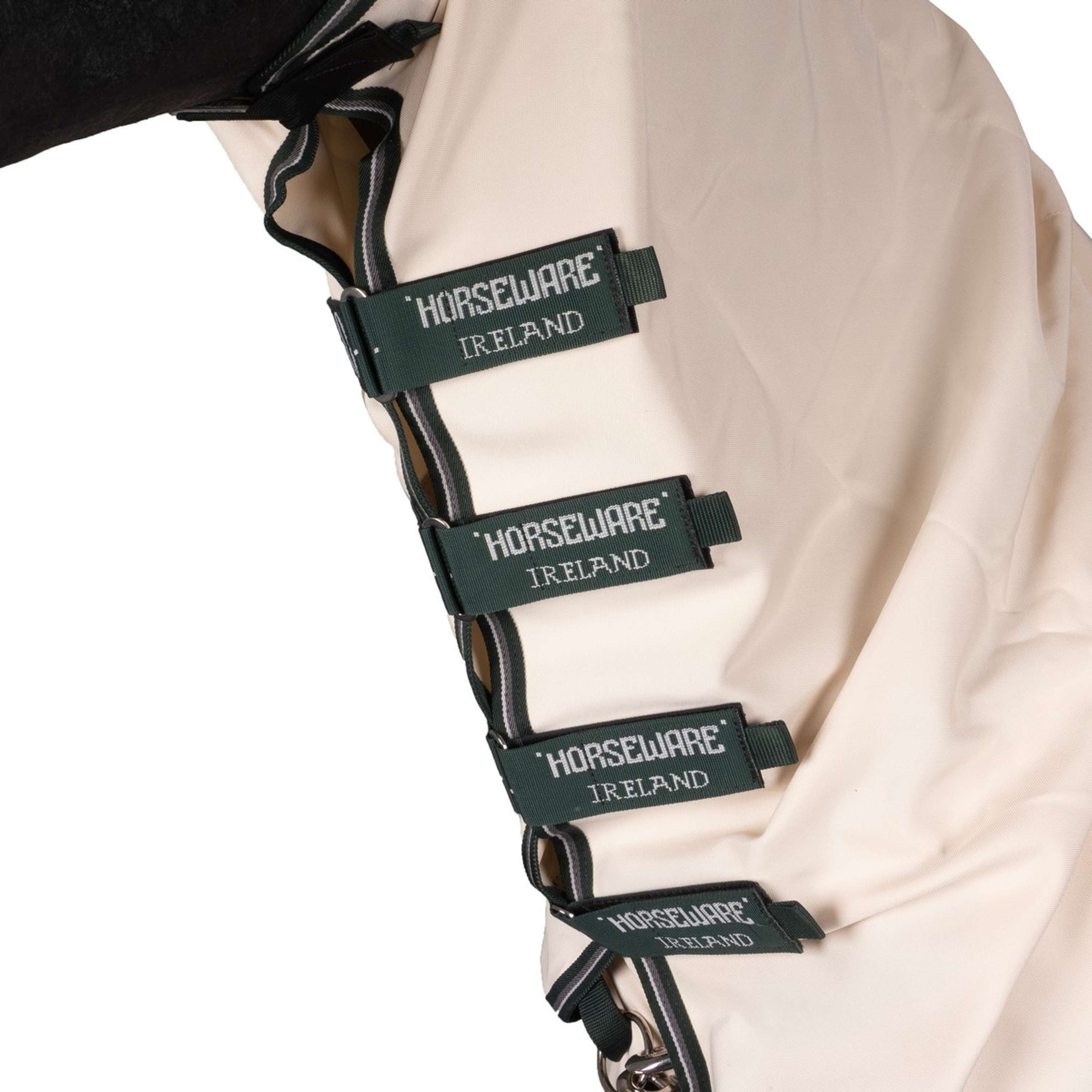 Copricollo integrato per andare sopra le orecchie per la massima copertura. Chiusura frontale a V per libertà di movimento. Fodera setosa su spalle, criniera e patta della coda per evitare lo sfregamento. Doppi archi per le gambe, tre sopraccinghie e protezione estesa per la pancia. Patta di coda sovradimensionata per una maggiore protezione e cinturino di coda.