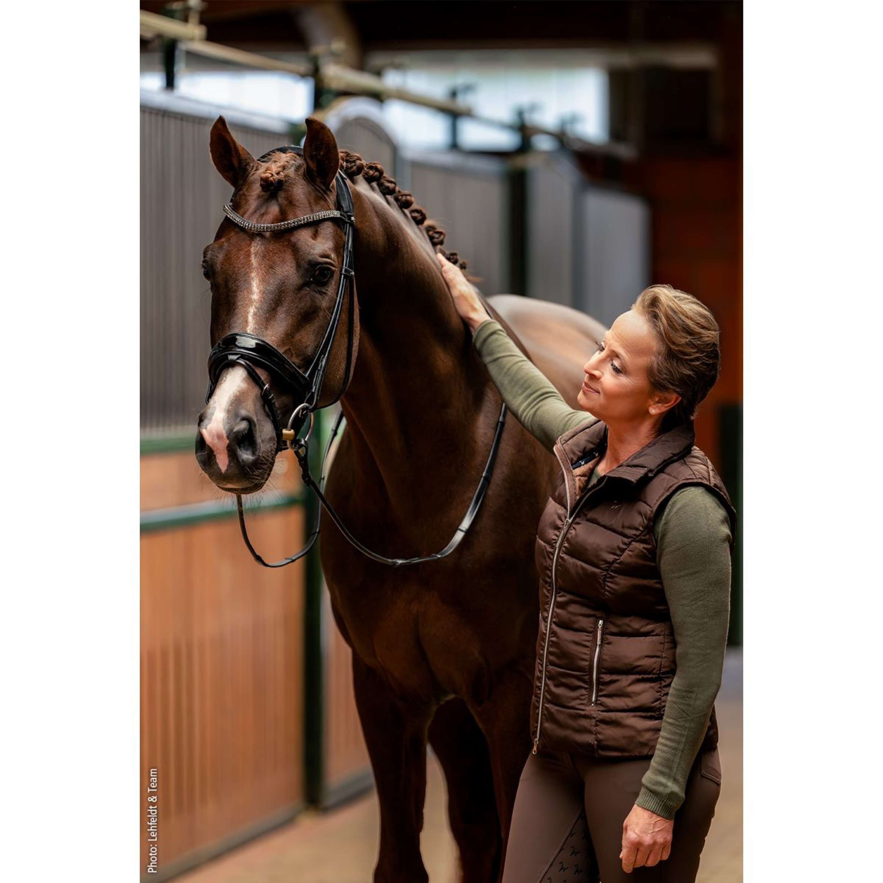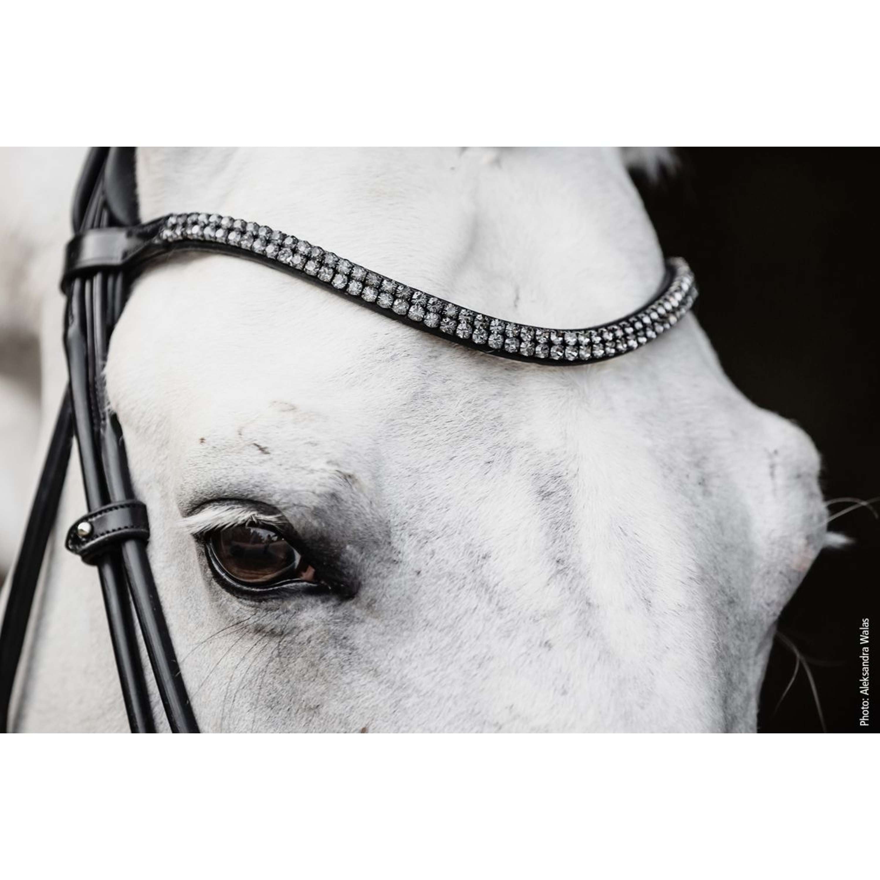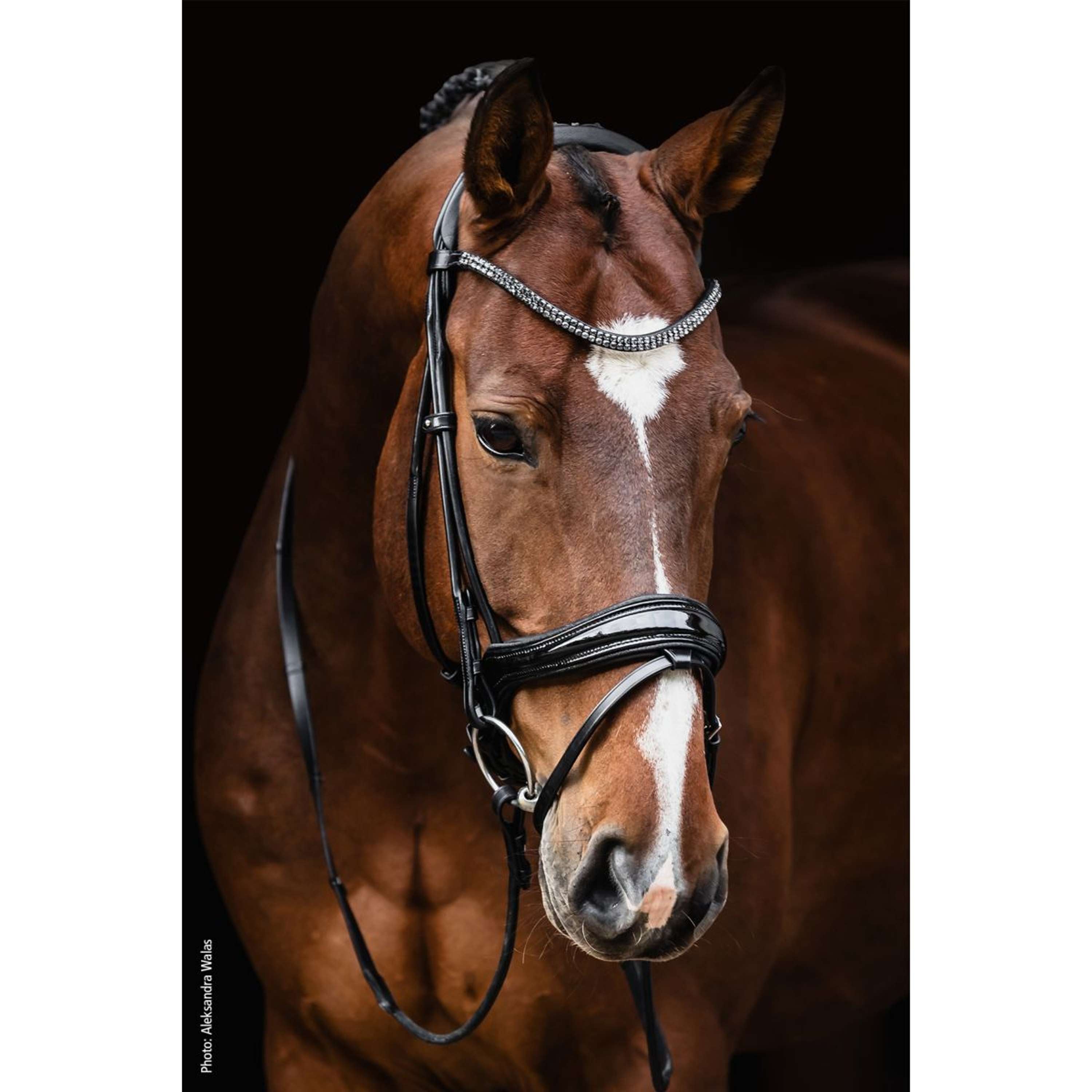 Una fascia stretta con due file di cristalli scintillanti e angolari aggiunge quel tocco in più all'aspetto complessivo. La versione in vinile con fini bordature garantisce un aspetto particolarmente elegante - nobile senza risultare invadente. Come elemento speciale, il marciapiede è dotato di una esclusiva borsa da brida in velluto Isabell Werth.